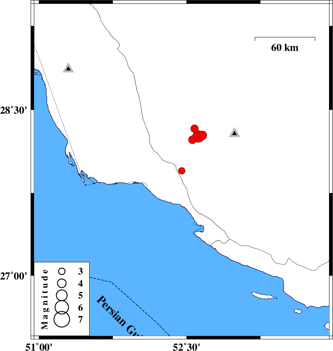 | 2010/11/26 | 12:33:44.5 | 16:03:44.5 | 28.26 | 52.62 | 9 | ML5.4 | Fars Province, 63 km South of Firuz Abad |