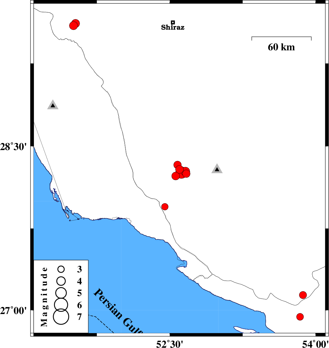 | 2010/11/26 | 12:33:44.5 | 16:03:44.5 | 28.26 | 52.62 | 9 | ML5.4 | Fars Province, 63 km South of Firuz Abad | ||