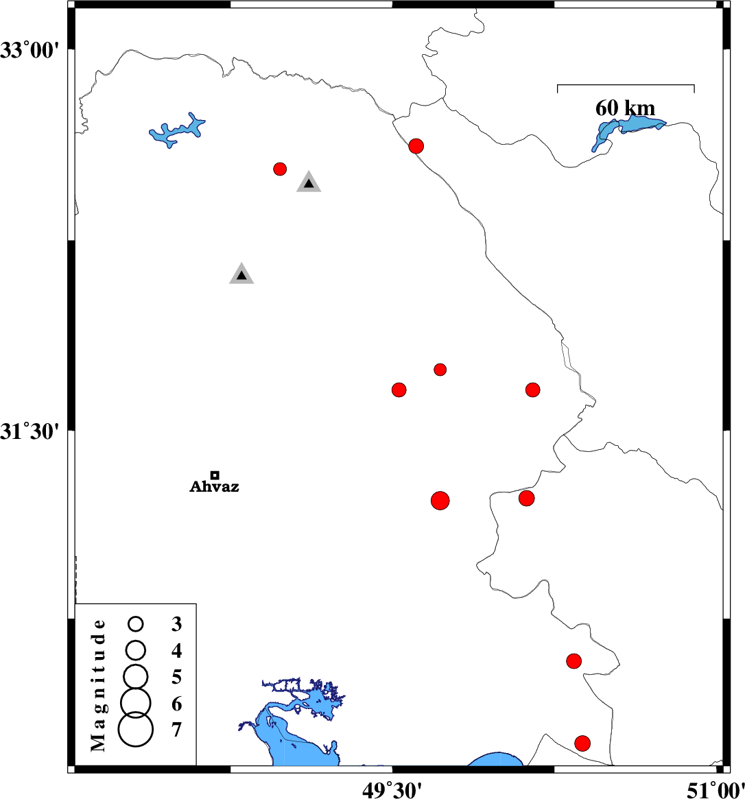 | 2010/11/26 | 01:07:02.4 | 04:37:02.4 | 31.22 | 49.72 | 33 | ML3.8 | Khoozestan Province, 12 km East of Ramhormoz | ||