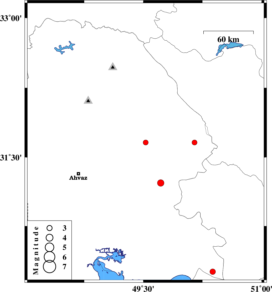 | 2010/11/26 | 01:07:02.4 | 04:37:02.4 | 31.22 | 49.72 | 33 | ML3.8 | Khoozestan Province, 12 km East of Ramhormoz |
