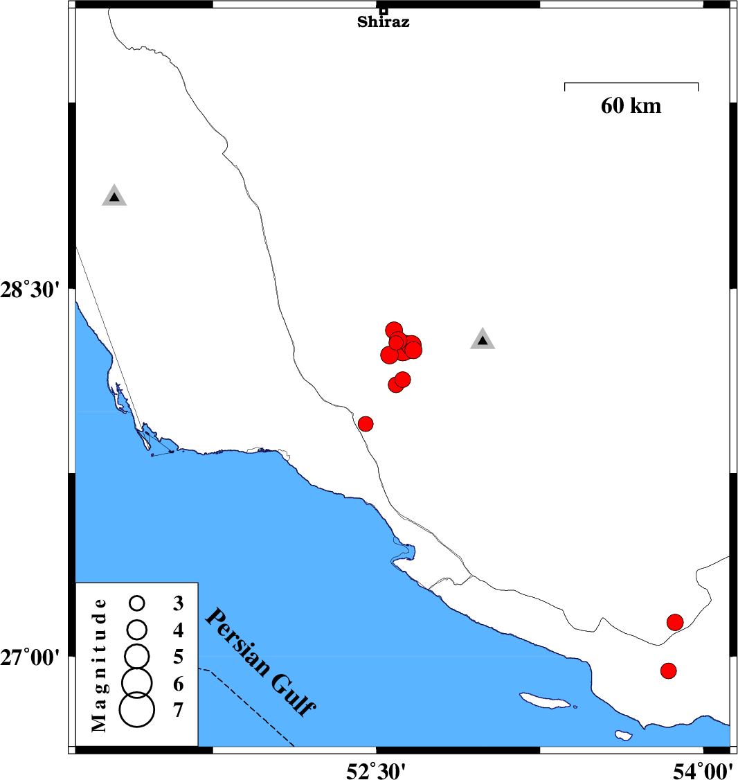 | 2010/11/26 | 13:27:42.6 | 16:57:42.6 | 28.27 | 52.66 | 8 | ML4.1 | Fars Province, 42 km South-West of Qir va Karzin | ||