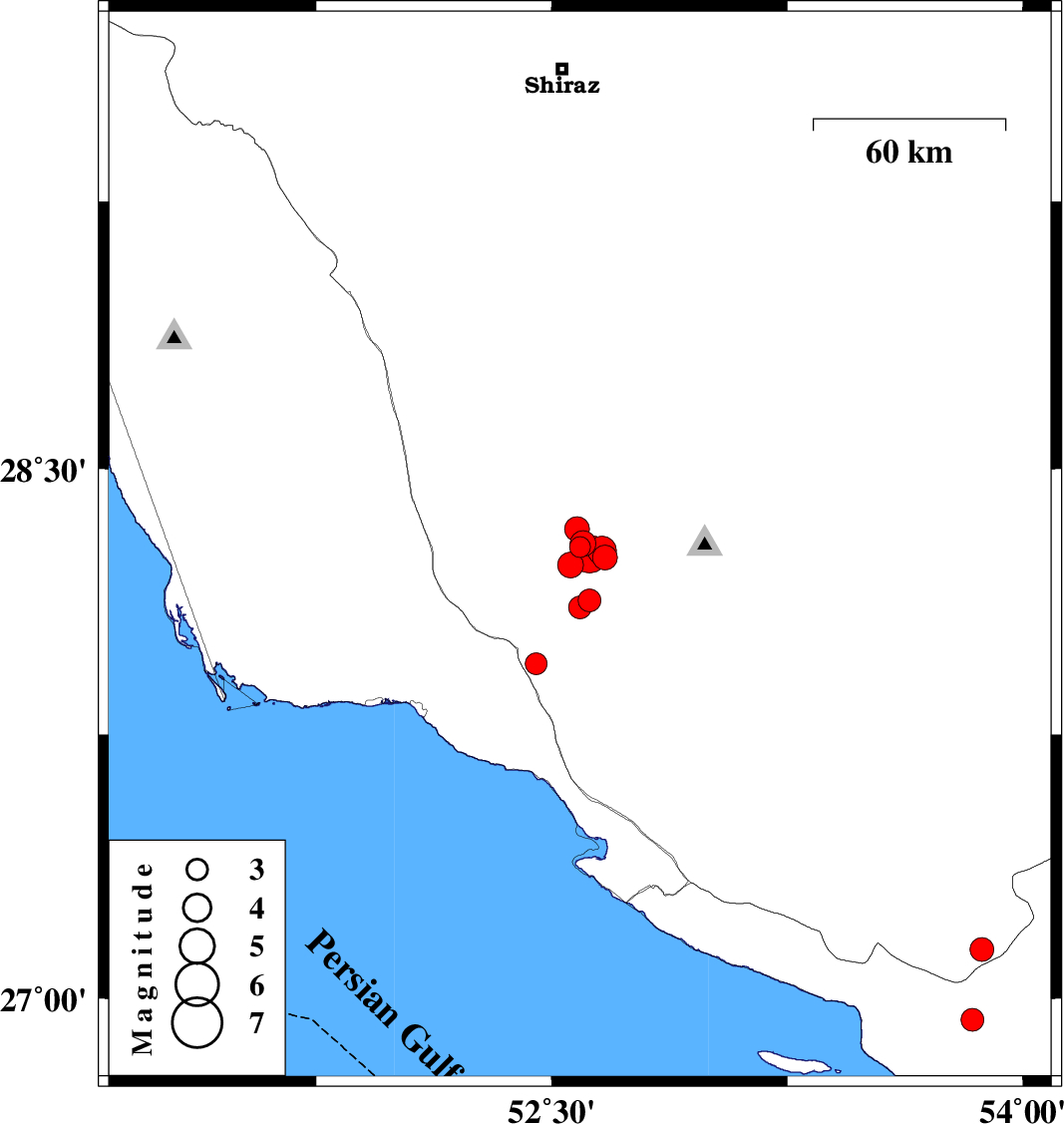 | 2010/11/26 | 13:27:42.6 | 16:57:42.6 | 28.27 | 52.66 | 8 | ML4.1 | Fars Province, 42 km South-West of Qir va Karzin | ||