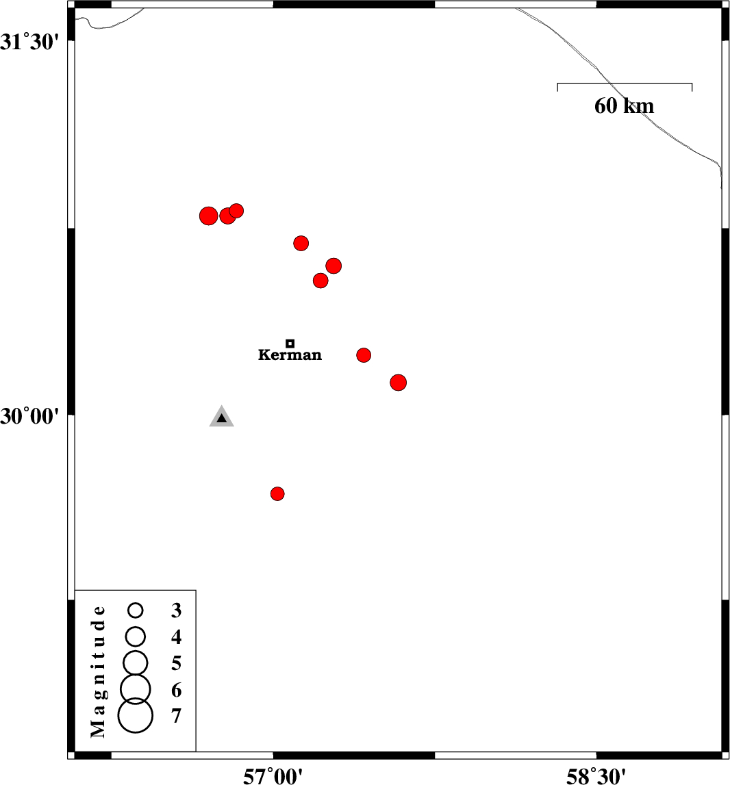 | 2010/11/17 | 10:14:02.6 | 13:44:02.6 | 30.54 | 57.22 | 15 | ML3.1 | Kerman Province, 31 km North-East of Kerman |