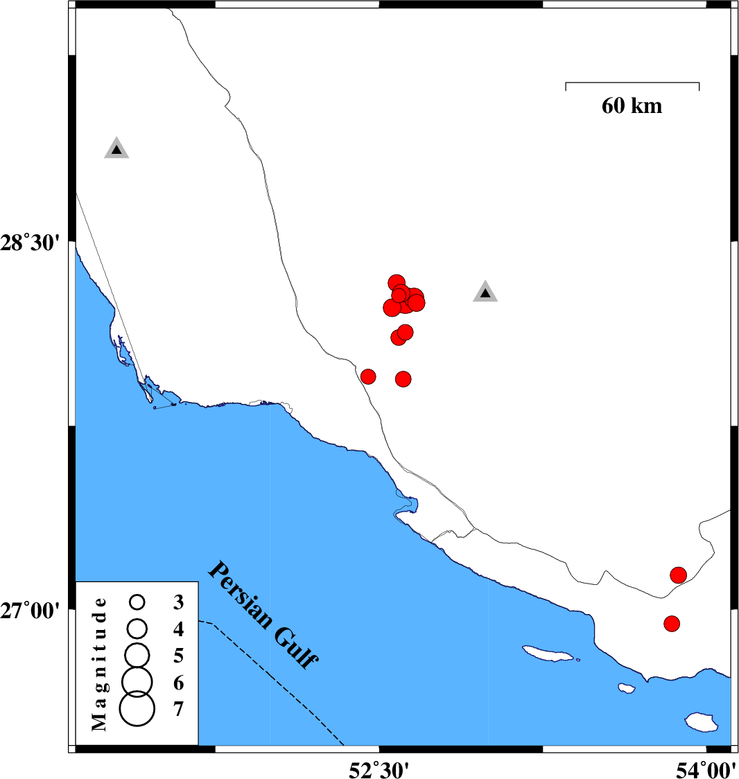 | 2010/11/26 | 13:27:42.6 | 16:57:42.6 | 28.27 | 52.66 | 8 | ML4.1 | Fars Province, 42 km South-West of Qir va Karzin | ||