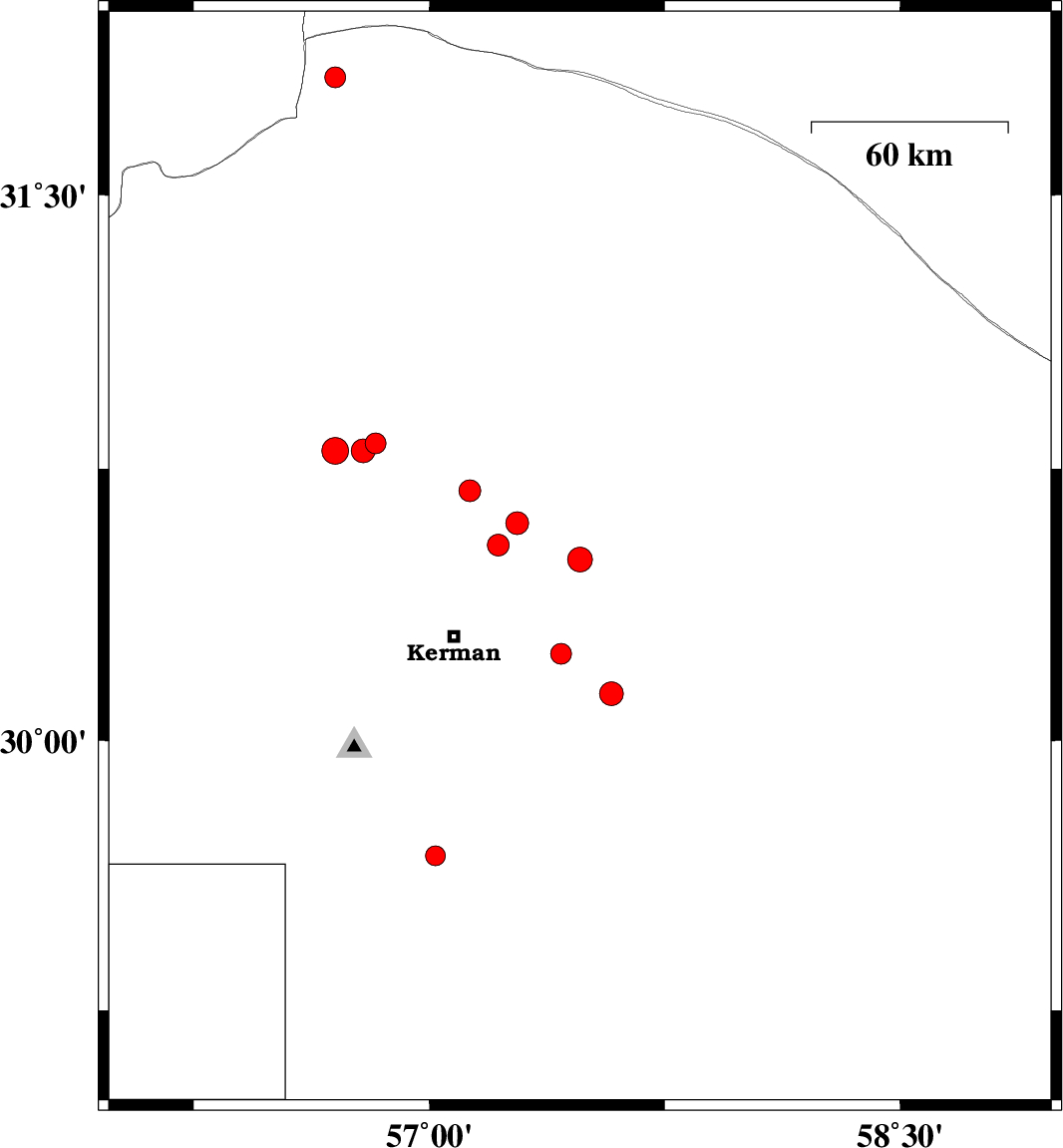 | 2010/11/13 | 08:36:43.6 | 12:06:43.6 | 31.82 | 56.7 | 31 | ML2.9 | Kerman Province, 63 km North-West of Ravar |