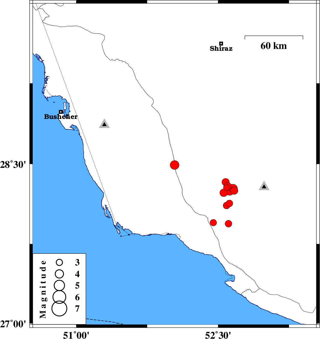 | 2010/11/26 | 12:33:44.5 | 16:03:44.5 | 28.26 | 52.62 | 9 | ML5.4 | Fars Province, 63 km South of Firuz Abad |