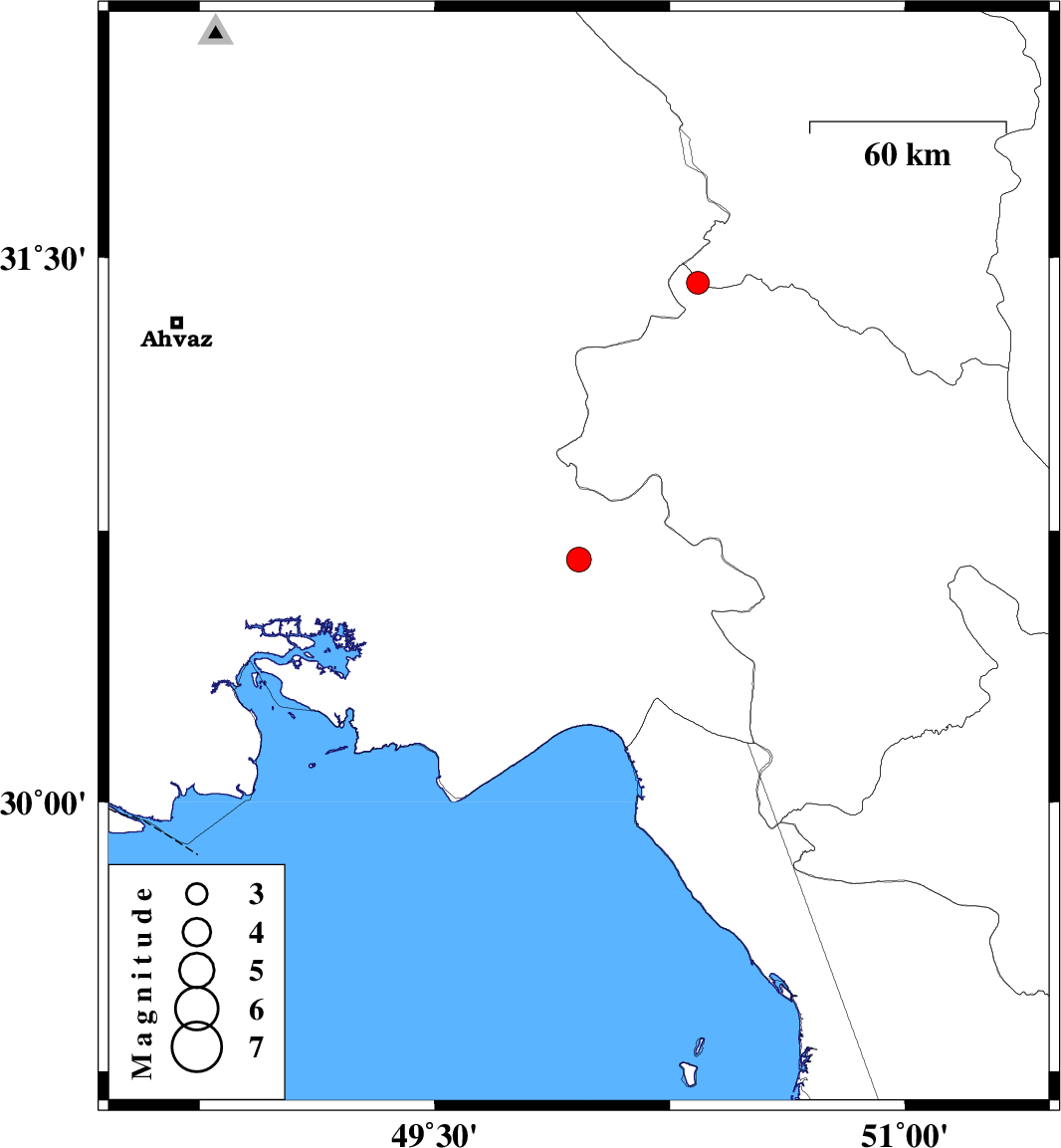 | 2010/12/15 | 09:15:09.9 | 12:45:09.9 | 30.67 | 49.96 | 18 | ML3.5 | Khoozestan Province, 26 km East of Omidiyeh |