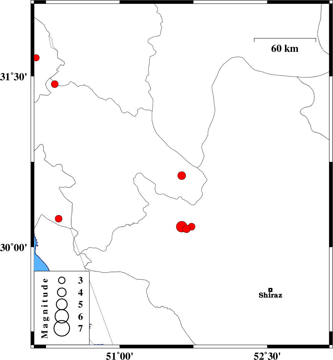 | 2010/12/07 | 11:51:58.6 | 15:21:58.6 | 30.16 | 51.68 | 43 | ML3.5 | Fars Province, 16 km East of Nurabad | ||
