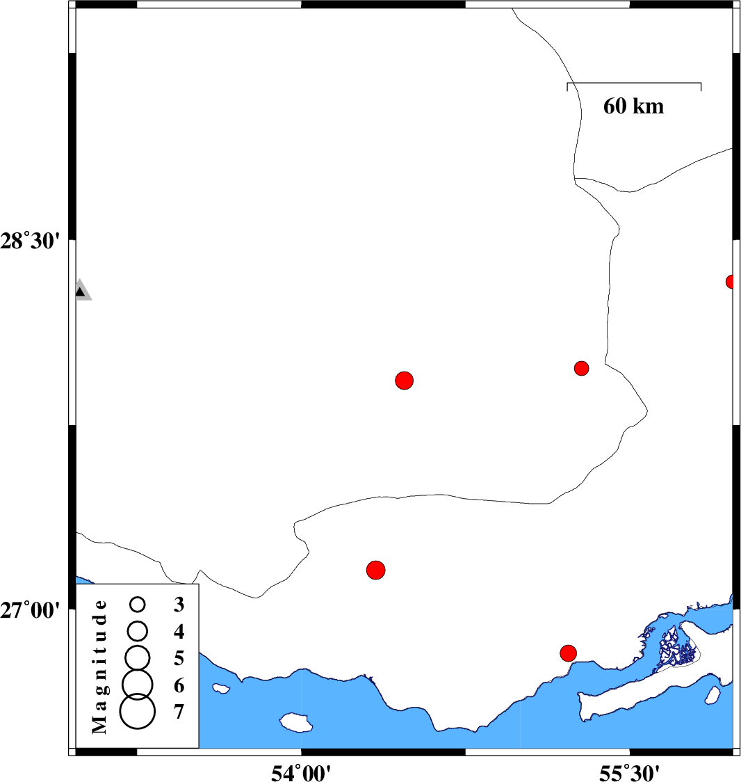 | 2010/12/16 | 17:43:00.2 | 21:13:00.2 | 27.93 | 54.47 | 35 | ML3.6 | Fars Province, 31 km North-East of Lar | ||