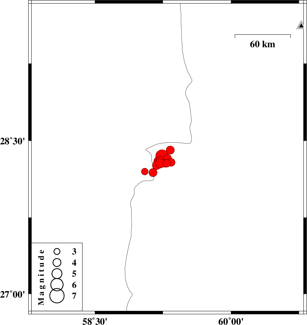 | 2010/12/20 | 06:36:55.5 | 10:06:55.5 | 28.2 | 59.05 | 14 | ML3.4 | Kerman Province, 136 km North-East of Kahnuj |