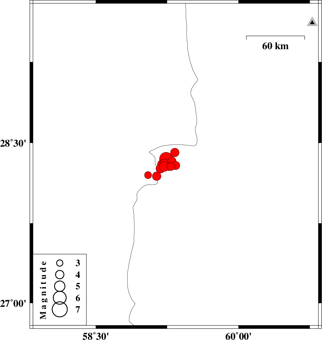 | 2010/12/20 | 06:36:55.5 | 10:06:55.5 | 28.2 | 59.05 | 14 | ML3.4 | Kerman Province, 136 km North-East of Kahnuj |