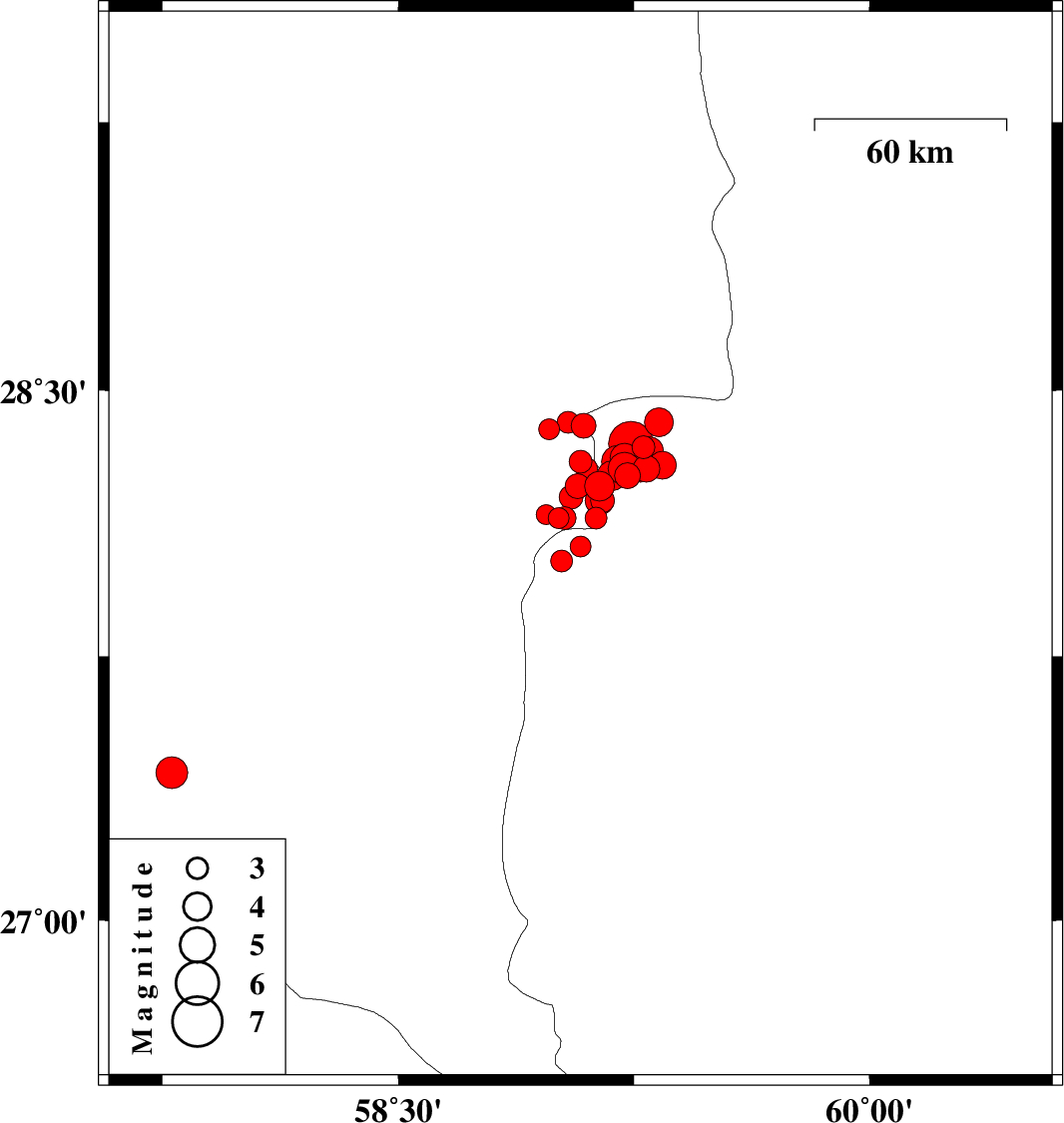 | 2010/12/21 | 12:51:39.8 | 16:21:39.8 | 28.06 | 59.08 | 46 | ML3 | Sistan va Baloochestan Province, 136 km North-East of Kahnuj | ||