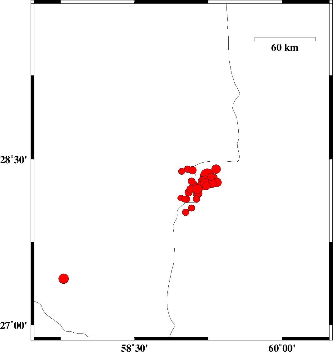| 2010/12/20 | 19:59:42.2 | 23:29:42.2 | 28.33 | 59.3 | 15 | ML3.9 | Sistan va Baloochestan Province, 126 km South-East of Bam | ||