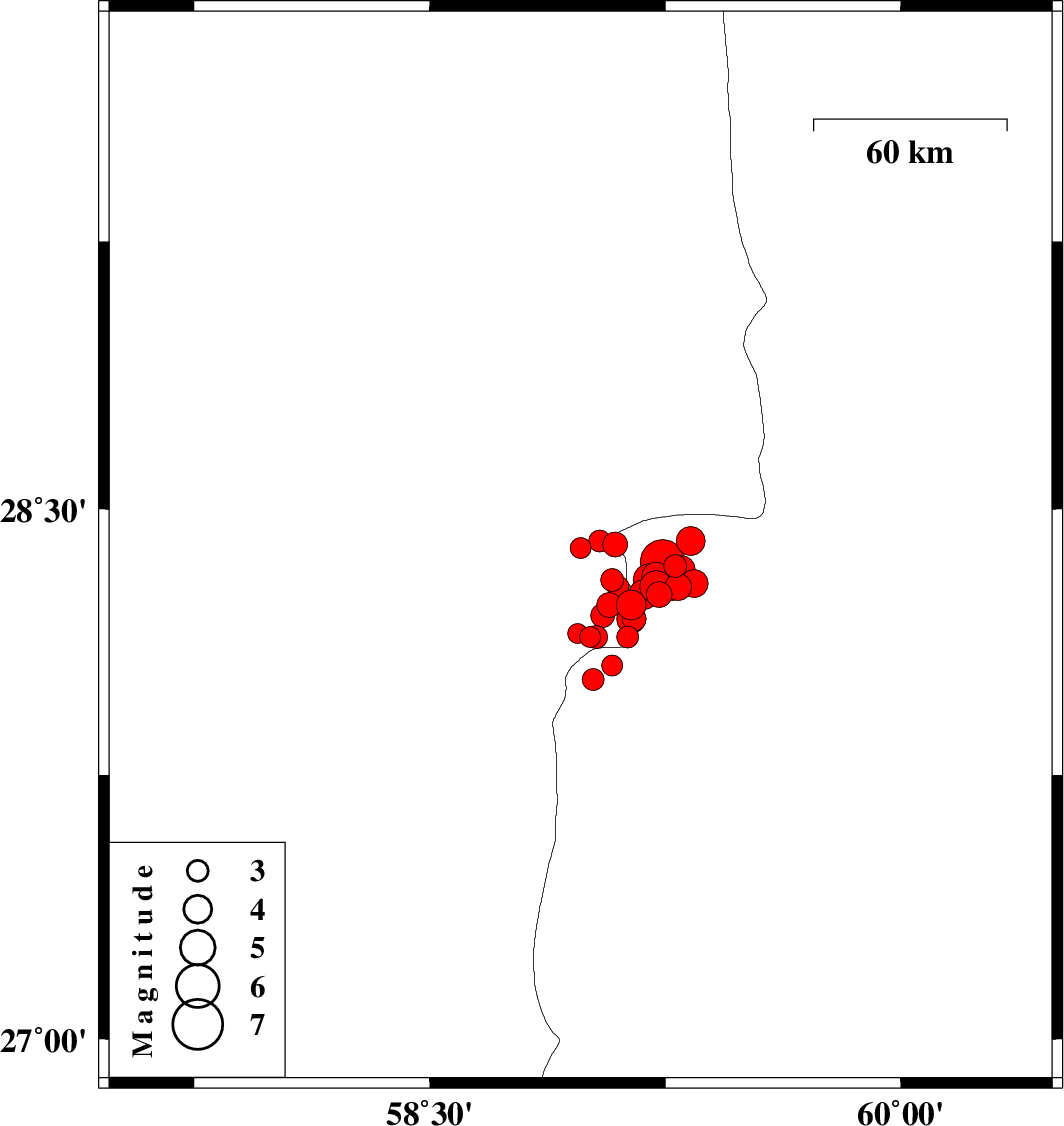 | 2010/12/21 | 09:24:37.8 | 12:54:37.8 | 28.23 | 59.07 | 44 | ML3.5 | Kerman Province, 120 km South-East of Bam | ||