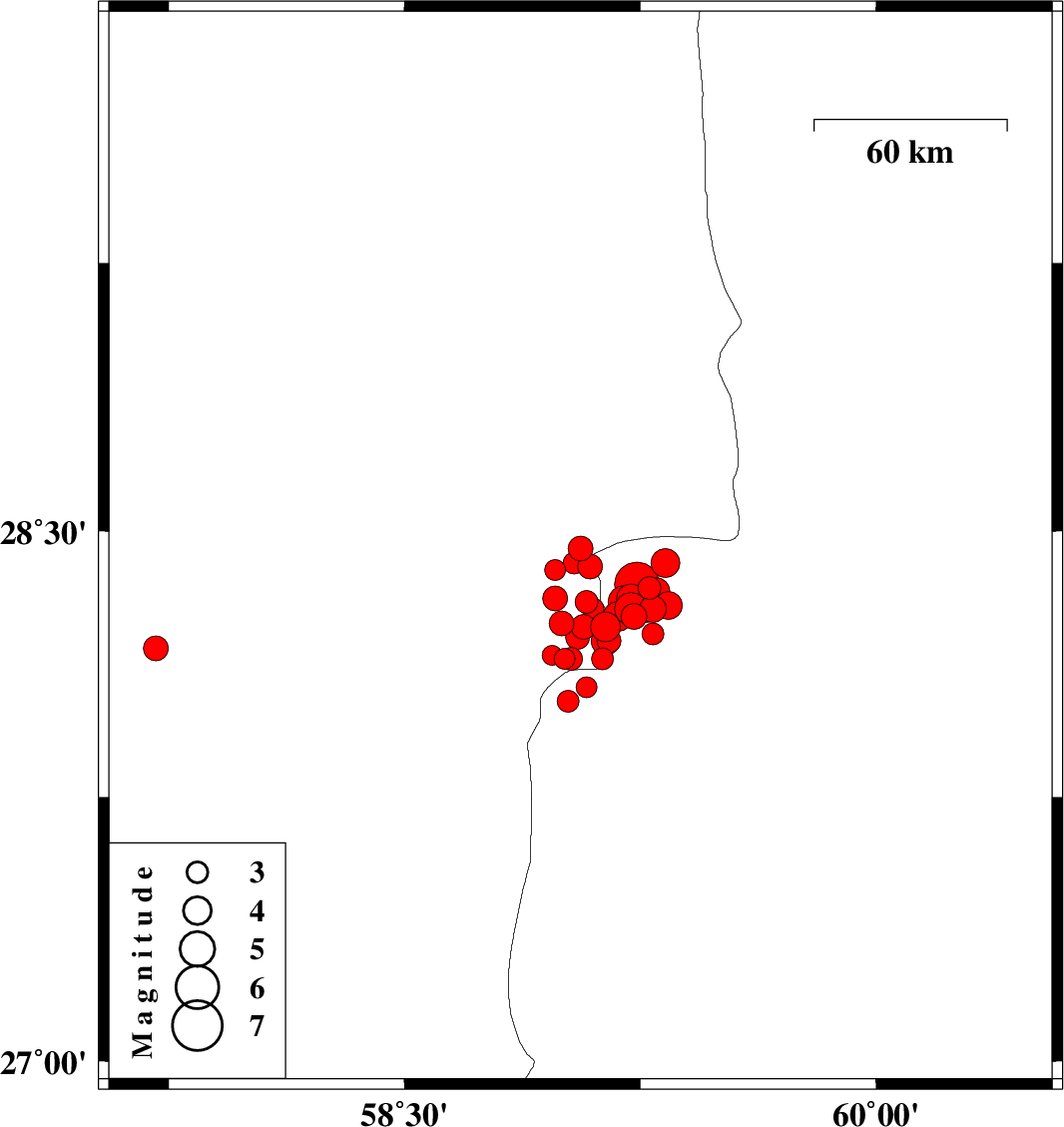 2010/12/22 07:58:26.5 11:28:26.5 28.245916 ML3.5 Kerman Province, 115 km South-East of Bam