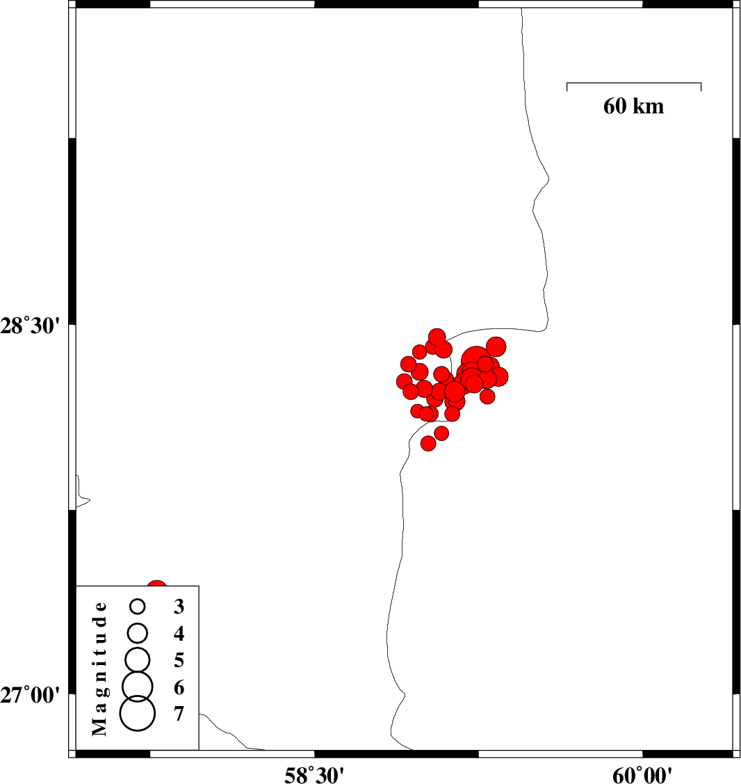 | 2010/12/20 | 18:41:58.1 | 22:11:58.1 | 28.35 | 59.24 | 17 | ML6.4 | Sistan va Baloochestan Province, 120 km South-East of Bam | ||