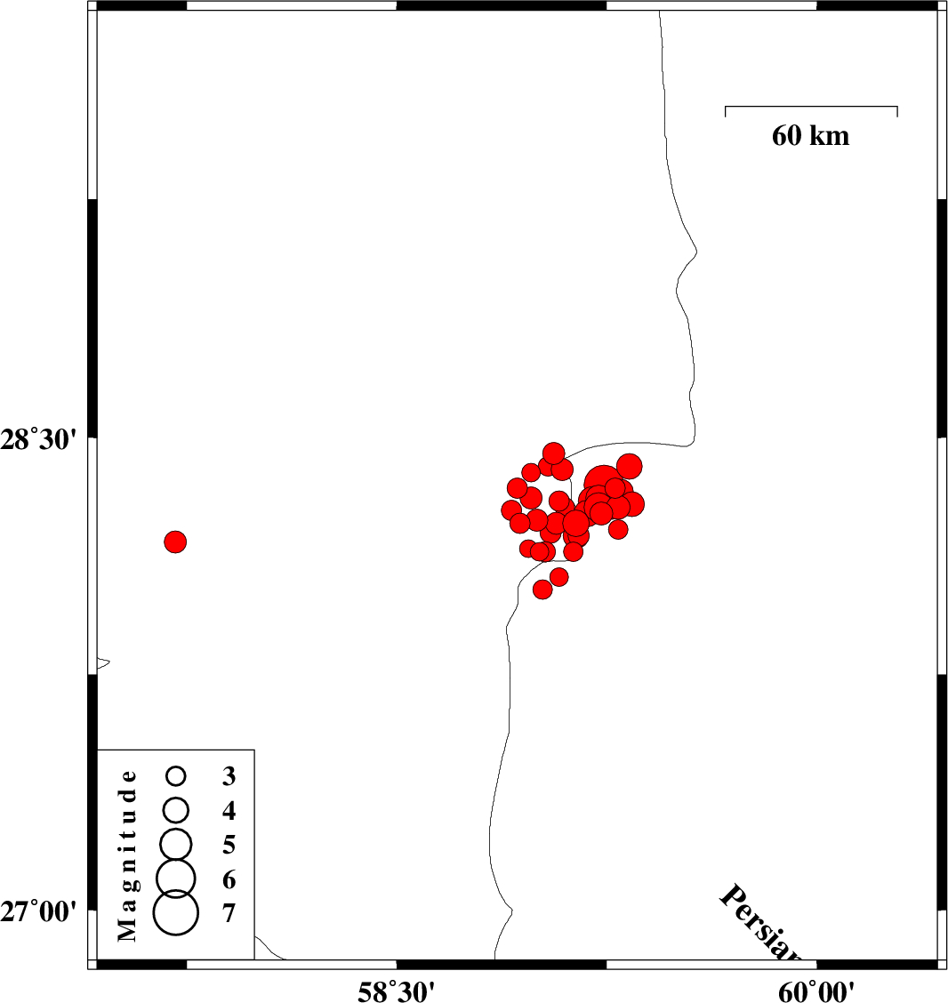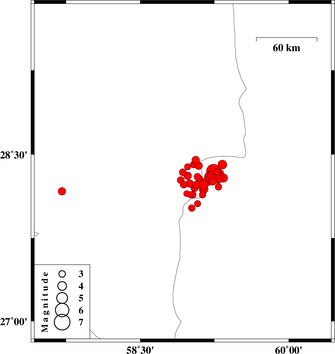 | 2010/11/23 | 13:03:23.8 | 16:33:23.8 | 28.17 | 57.71 | 18 | ML3.5 | Kerman Province, 25 km North of Kahnuj |