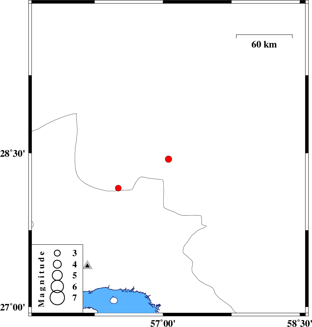 | 2010/12/25 | 05:54:16.5 | 09:24:16.5 | 28.44 | 57.06 | 14 | ML3.3 | Kerman Province, 71 km South-West of Jiroft | ||