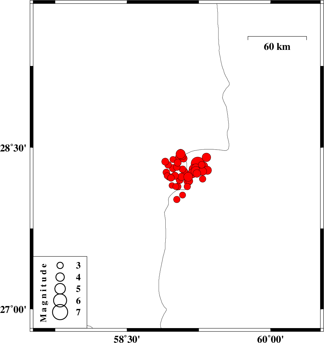 2010/12/22 07:58:26.5 11:28:26.5 28.245916 ML3.5 Kerman Province, 115 km South-East of Bam