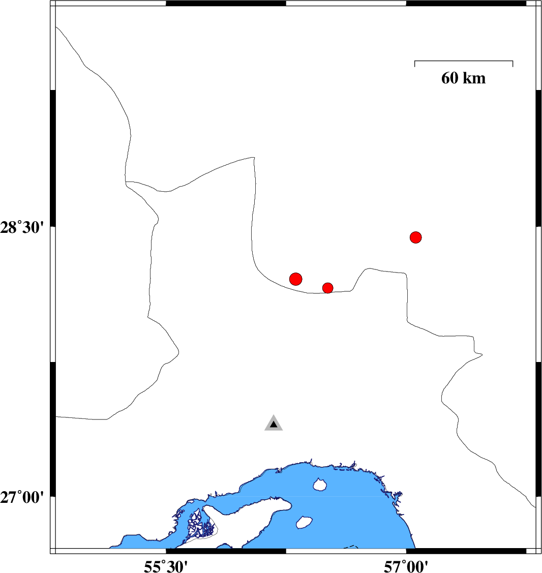 | 2010/12/25 | 05:54:16.5 | 09:24:16.5 | 28.44 | 57.06 | 14 | ML3.3 | Kerman Province, 71 km South-West of Jiroft | ||