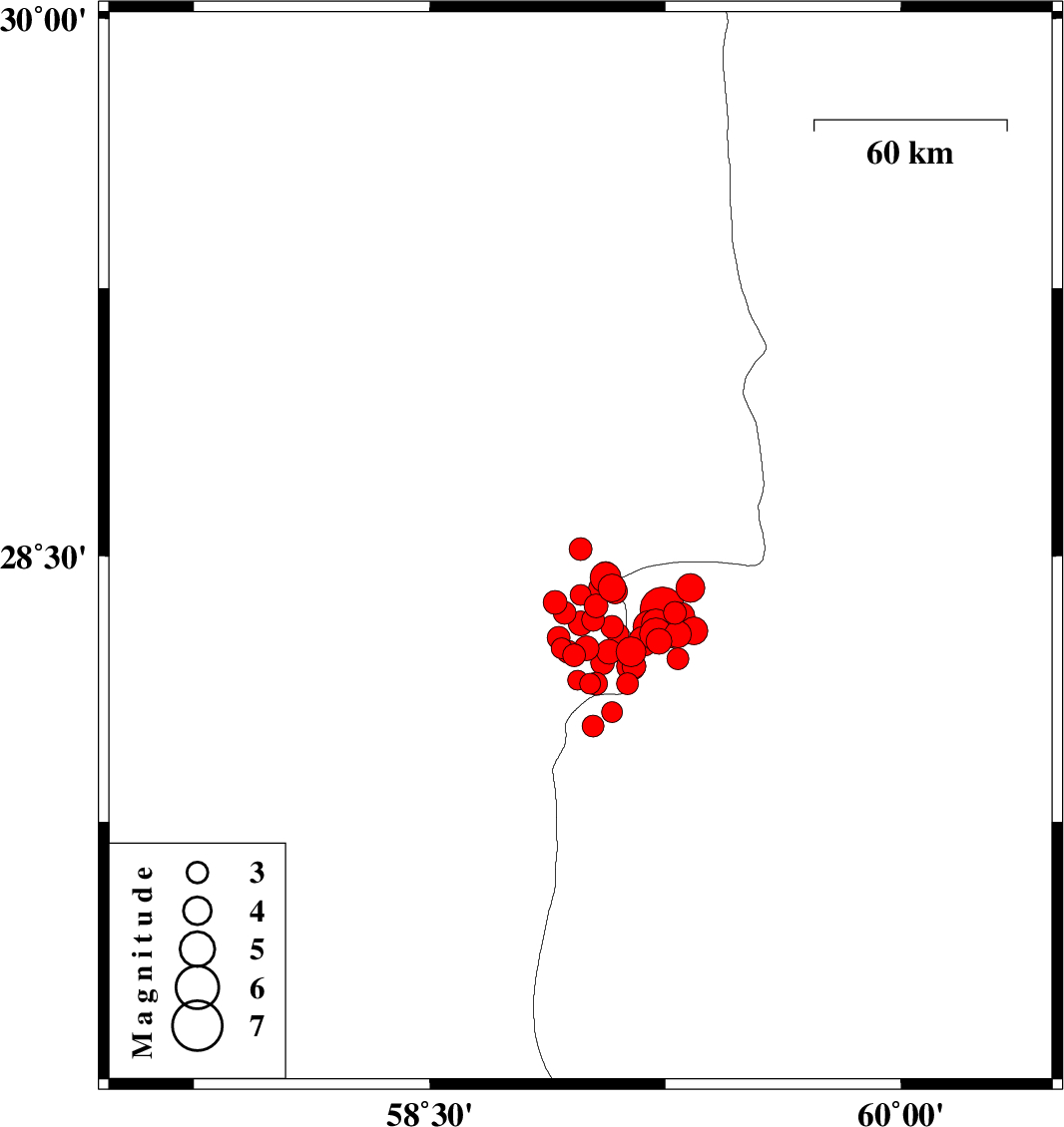 | 2010/12/22 | 07:58:26.5 | 11:28:26.5 | 28.24 | 59 | 16 | ML3.5 | Kerman Province, 115 km South-East of Bam | ||