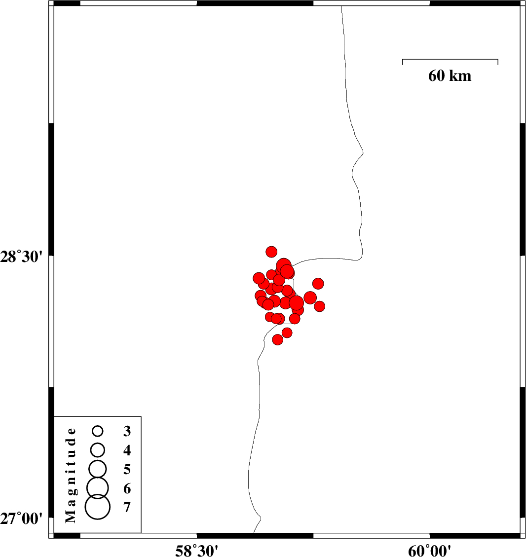 | 2010/12/28 | 03:06:28.1 | 06:36:28.1 | 28.52 | 58.98 | 14 | ML3.2 | Kerman Province, 89 km South-East of Bam | ||