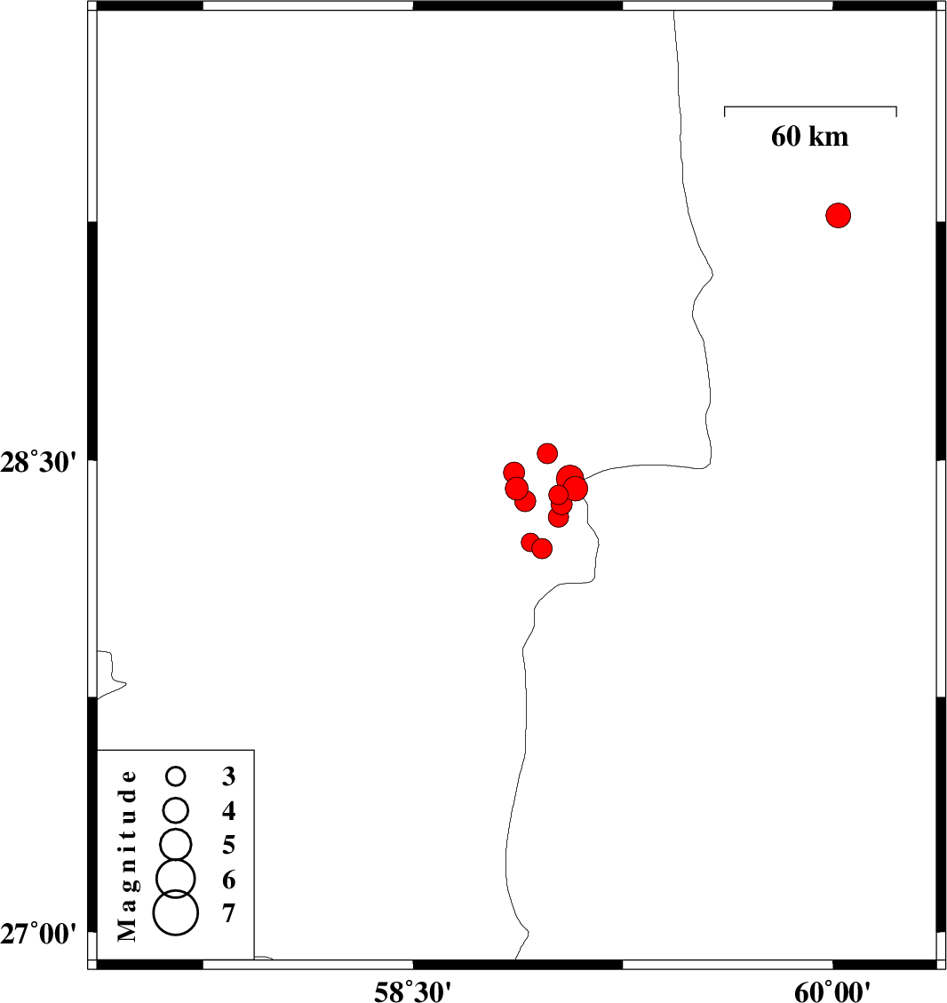 | 2010/12/28 | 03:06:28.1 | 06:36:28.1 | 28.52 | 58.98 | 14 | ML3.2 | Kerman Province, 89 km South-East of Bam | ||