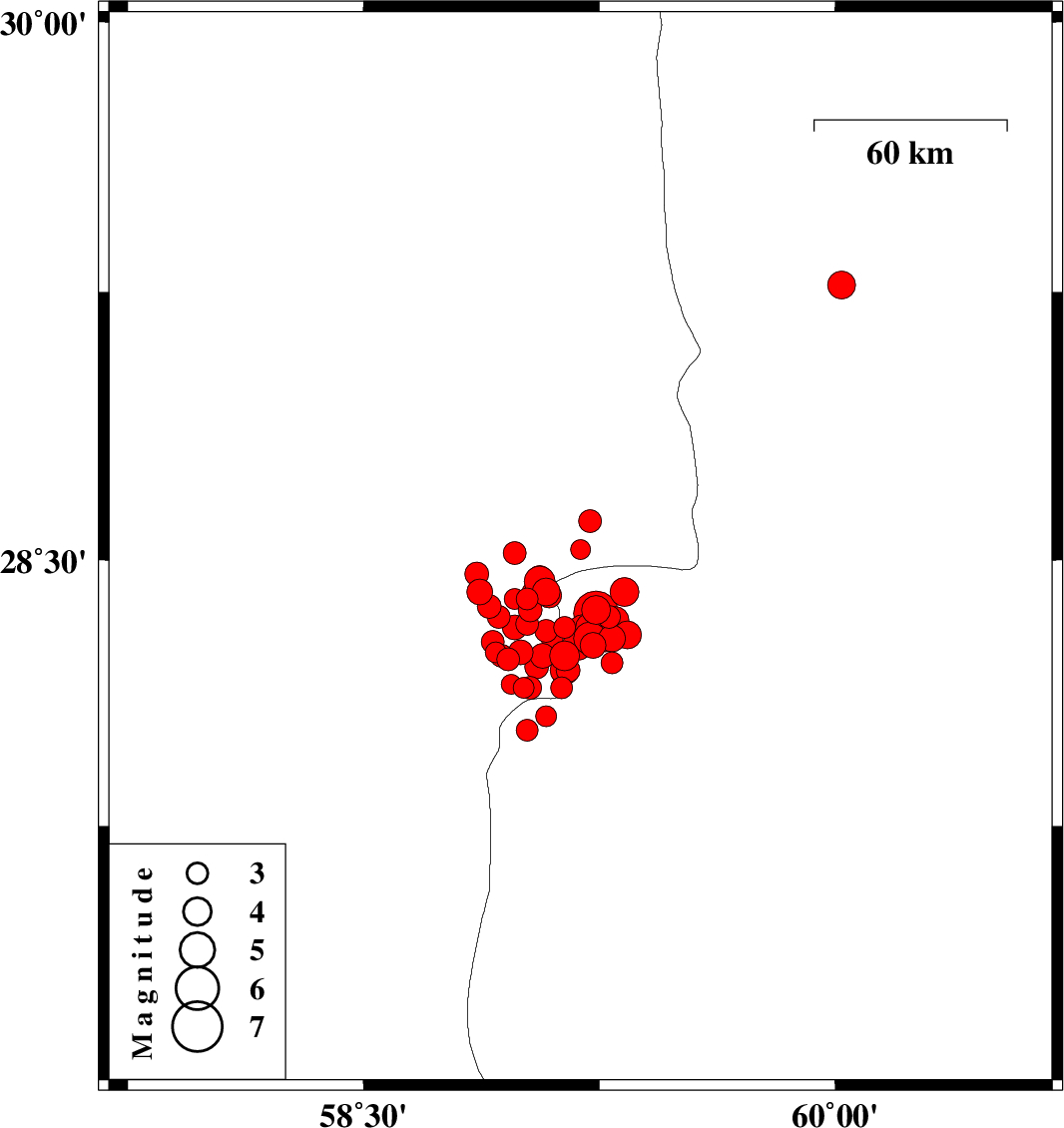 | 2010/12/28 | 03:06:28.1 | 06:36:28.1 | 28.52 | 58.98 | 14 | ML3.2 | Kerman Province, 89 km South-East of Bam | ||