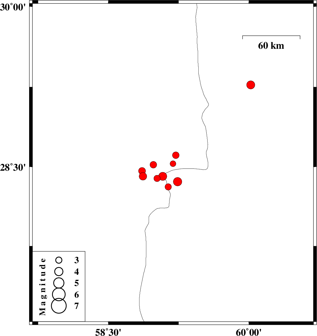 | 2010/12/28 | 03:06:28.1 | 06:36:28.1 | 28.52 | 58.98 | 14 | ML3.2 | Kerman Province, 89 km South-East of Bam |