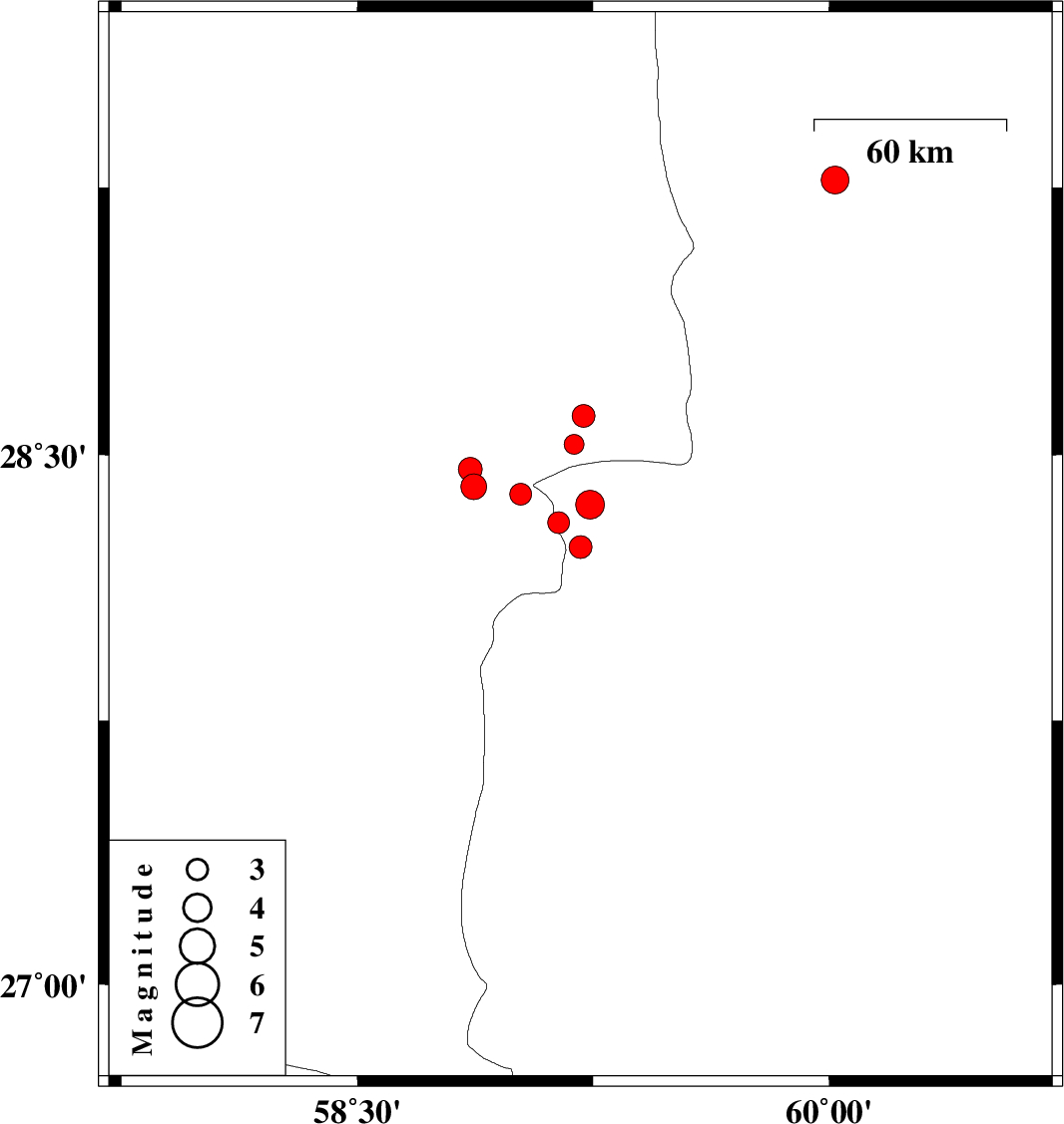 | 2010/12/30 | 02:43:03.0 | 06:13:03.0 | 28.46 | 58.86 | 18 | ML3.4 | Kerman Province, 87 km South-East of Bam |