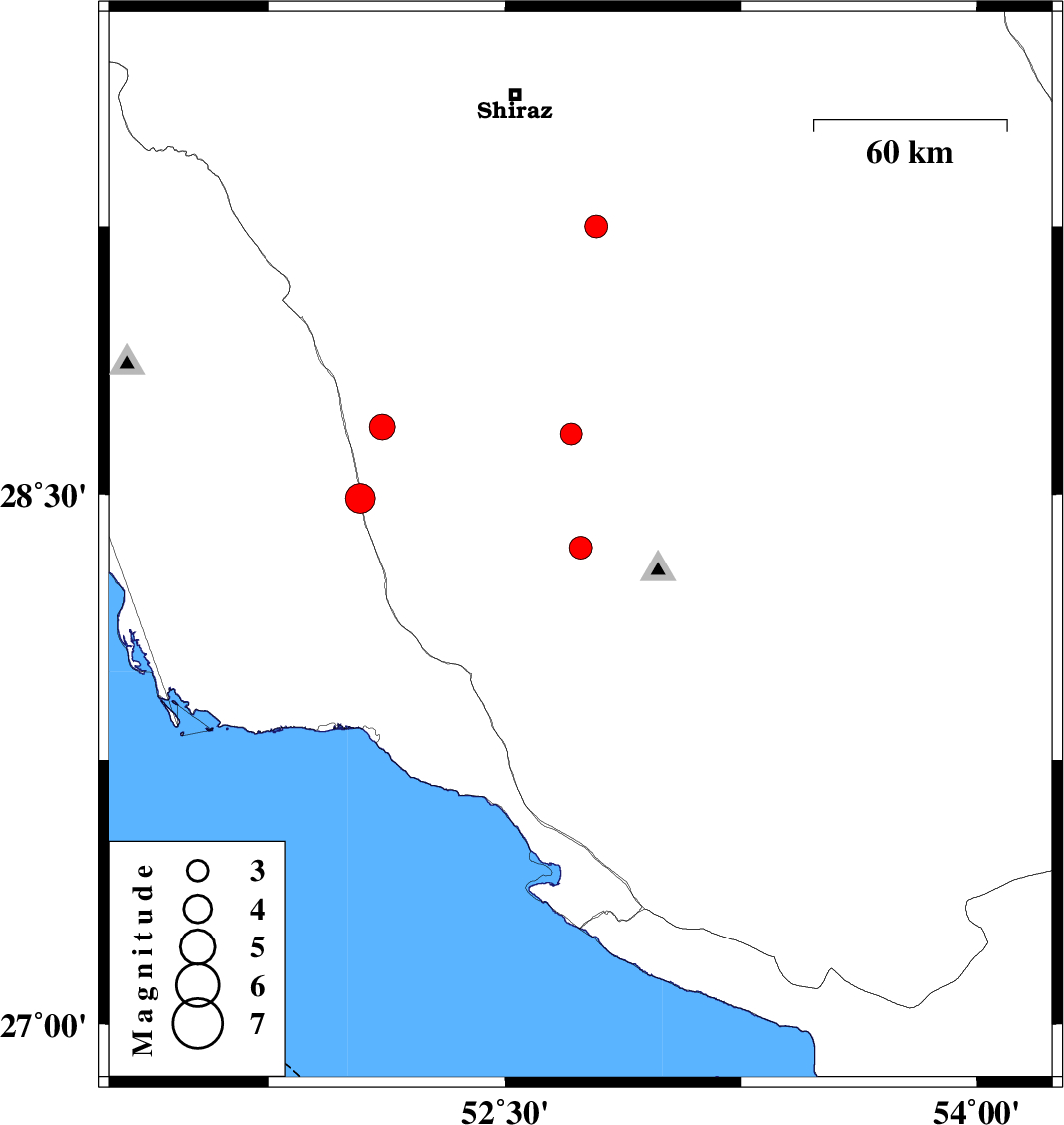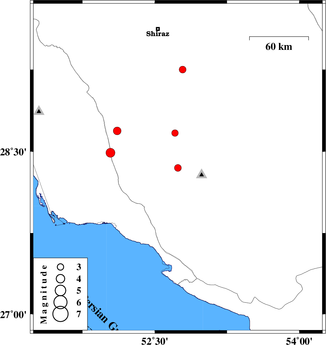 | 2010/12/09 | 18:14:45.1 | 21:44:45.1 | 28.49 | 52.04 | 35 | ML4.3 | Bushehr Province, 43 km South of Farashband |