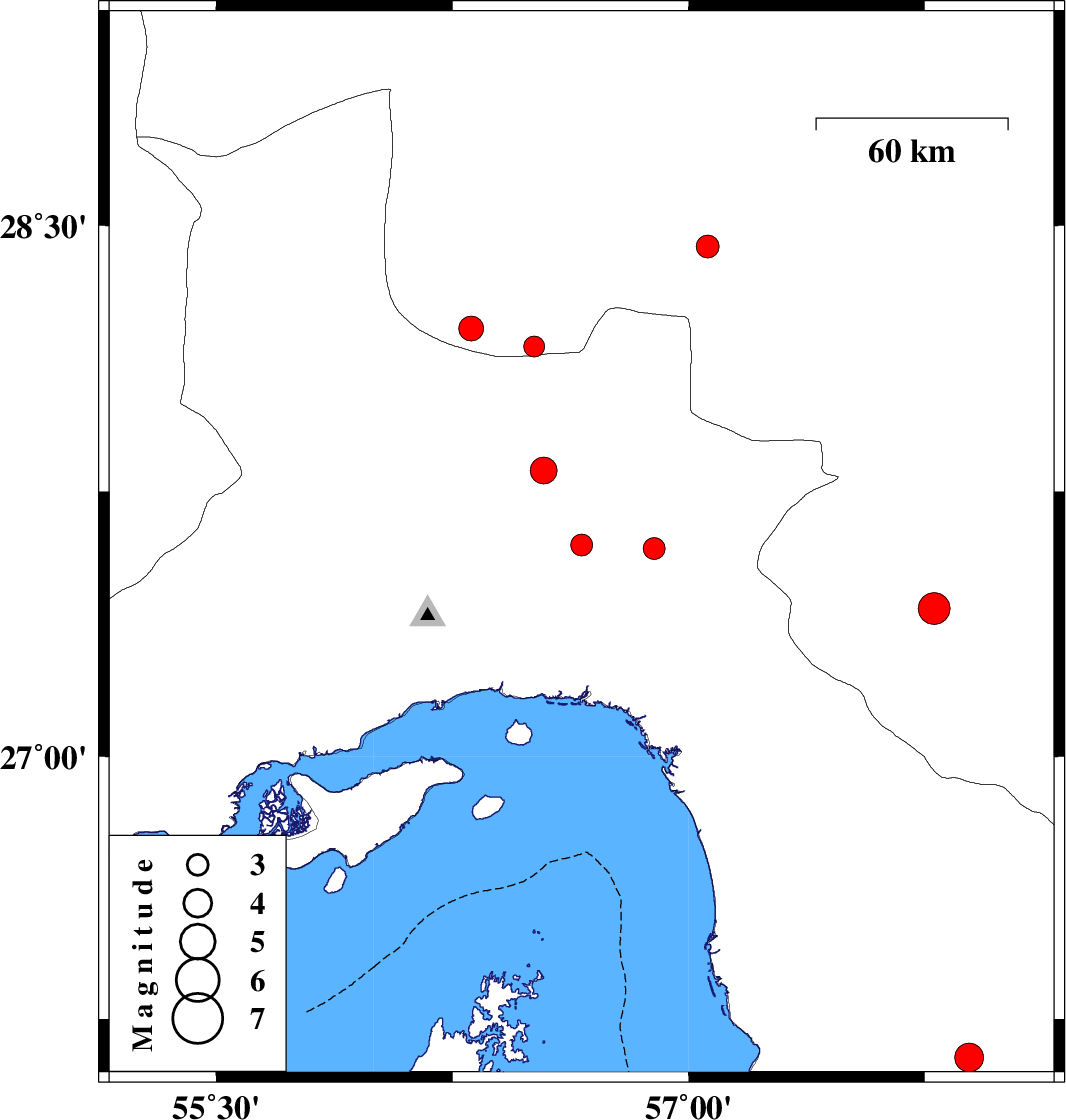 | 2011/01/06 | 00:45:08.2 | 04:15:08.2 | 27.59 | 56.89 | 30 | ML3.1 | Hormozgan Province, 39 km North-West of Dehbarez | ||