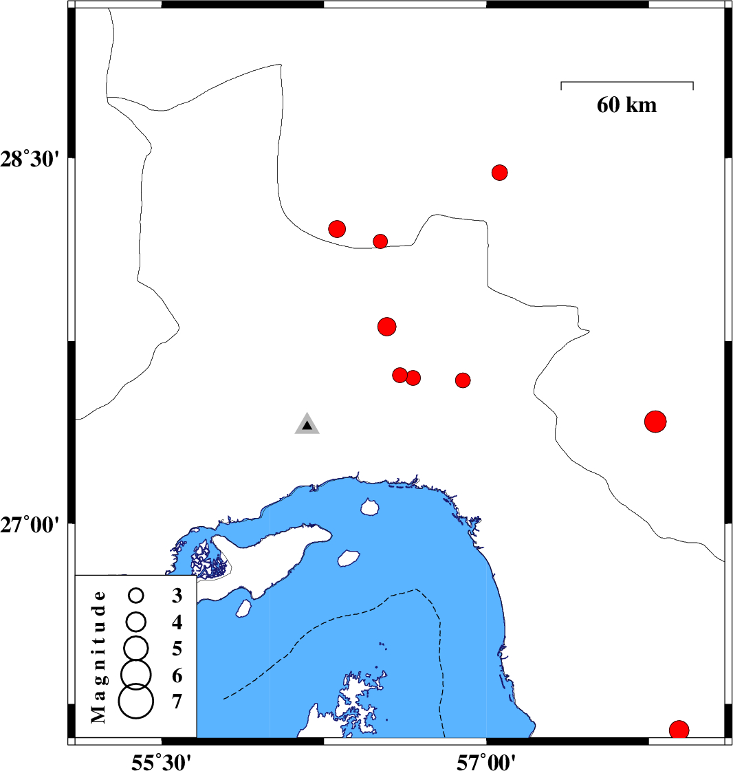 | 2011/01/06 | 00:45:08.2 | 04:15:08.2 | 27.59 | 56.89 | 30 | ML3.1 | Hormozgan Province, 39 km North-West of Dehbarez | ||