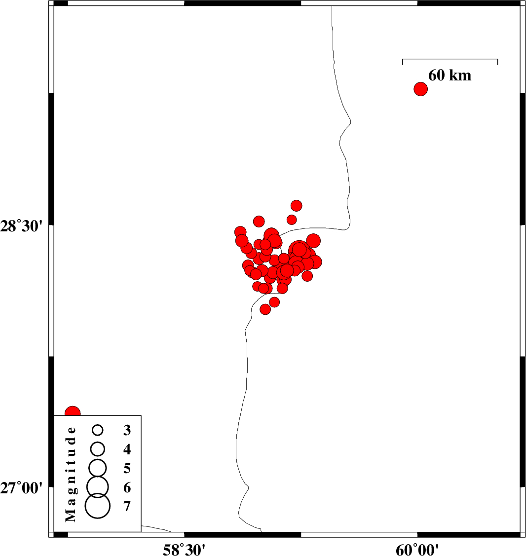 | 2010/12/22 | 07:58:26.5 | 11:28:26.5 | 28.24 | 59 | 16 | ML3.5 | Kerman Province, 115 km South-East of Bam | ||