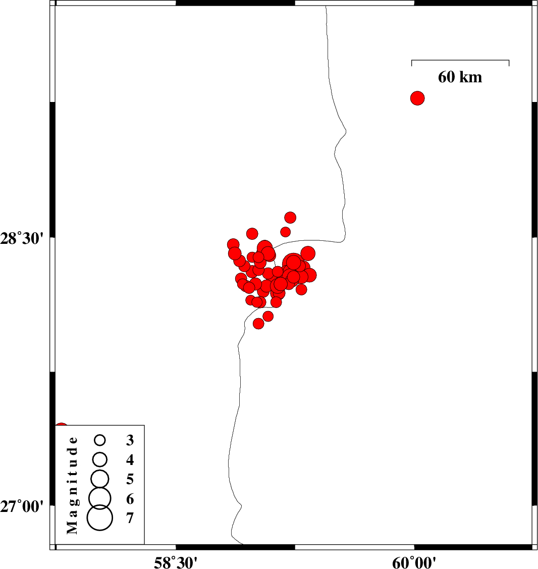 | 2010/12/22 | 07:58:26.5 | 11:28:26.5 | 28.24 | 59 | 16 | ML3.5 | Kerman Province, 115 km South-East of Bam | ||