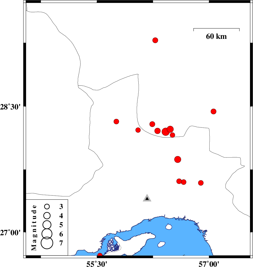| 2011/01/18 | 13:56:44.5 | 17:26:44.5 | 28.32 | 55.76 | 15 | ML3.1 | Hormozgan Province, 14 km West of Hajiabad | ||