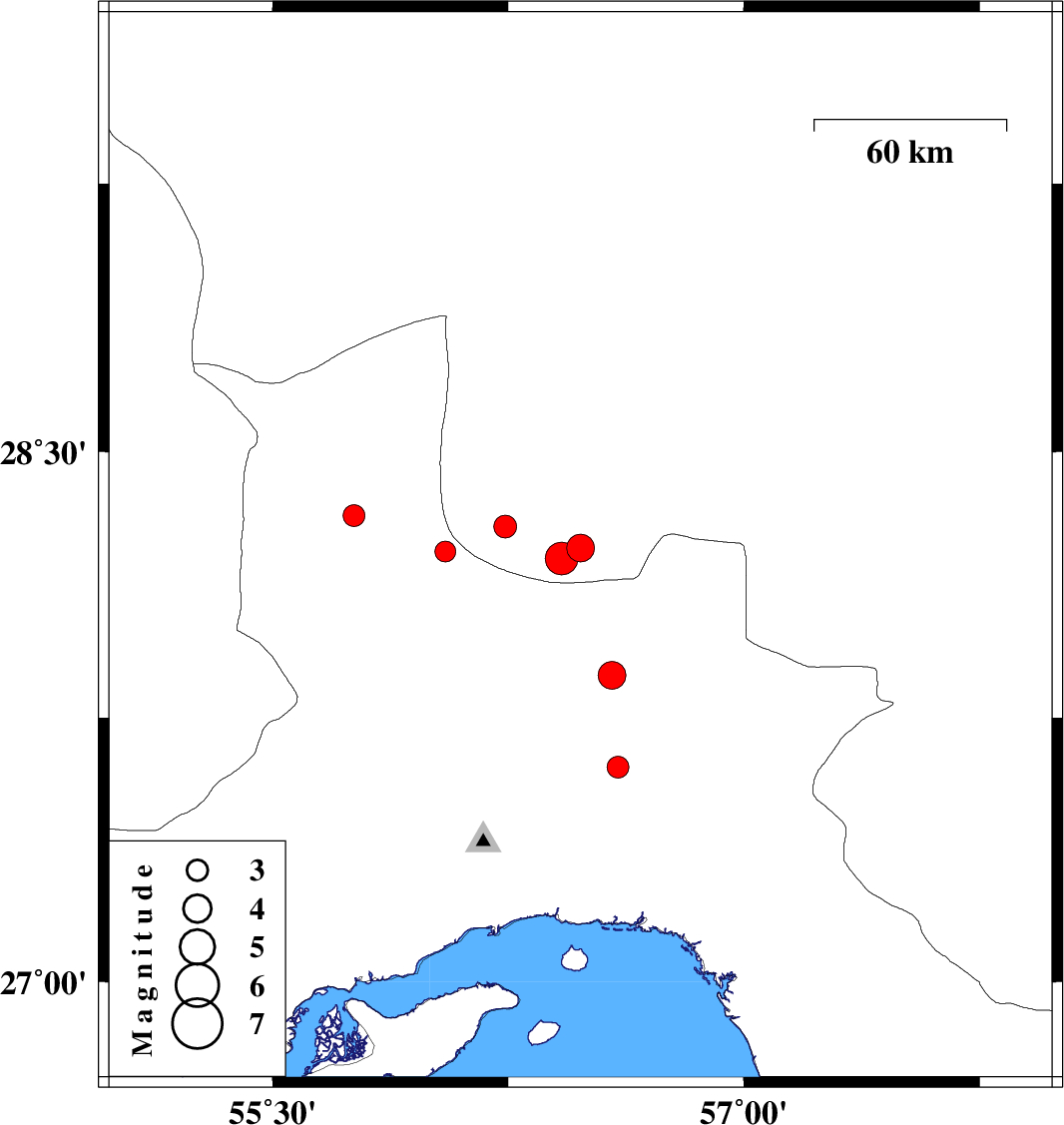 | 2011/01/11 | 08:09:03.3 | 11:39:03.3 | 27.61 | 56.6 | 14 | ML3.1 | Hormozgan Province, 57 km North-East of Bandar-e abbas |