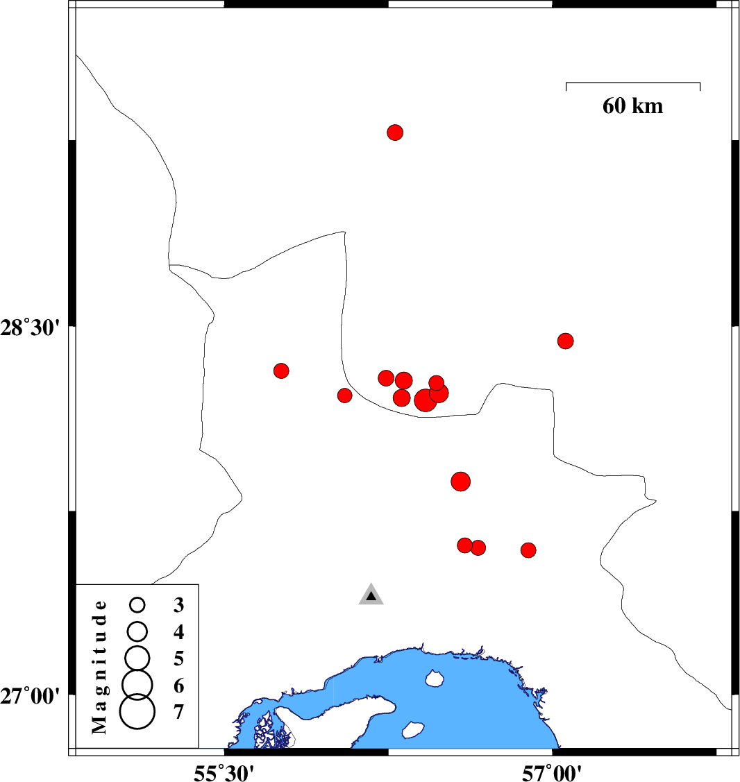 | 2011/01/18 | 13:56:44.5 | 17:26:44.5 | 28.32 | 55.76 | 15 | ML3.1 | Hormozgan Province, 14 km West of Hajiabad | ||