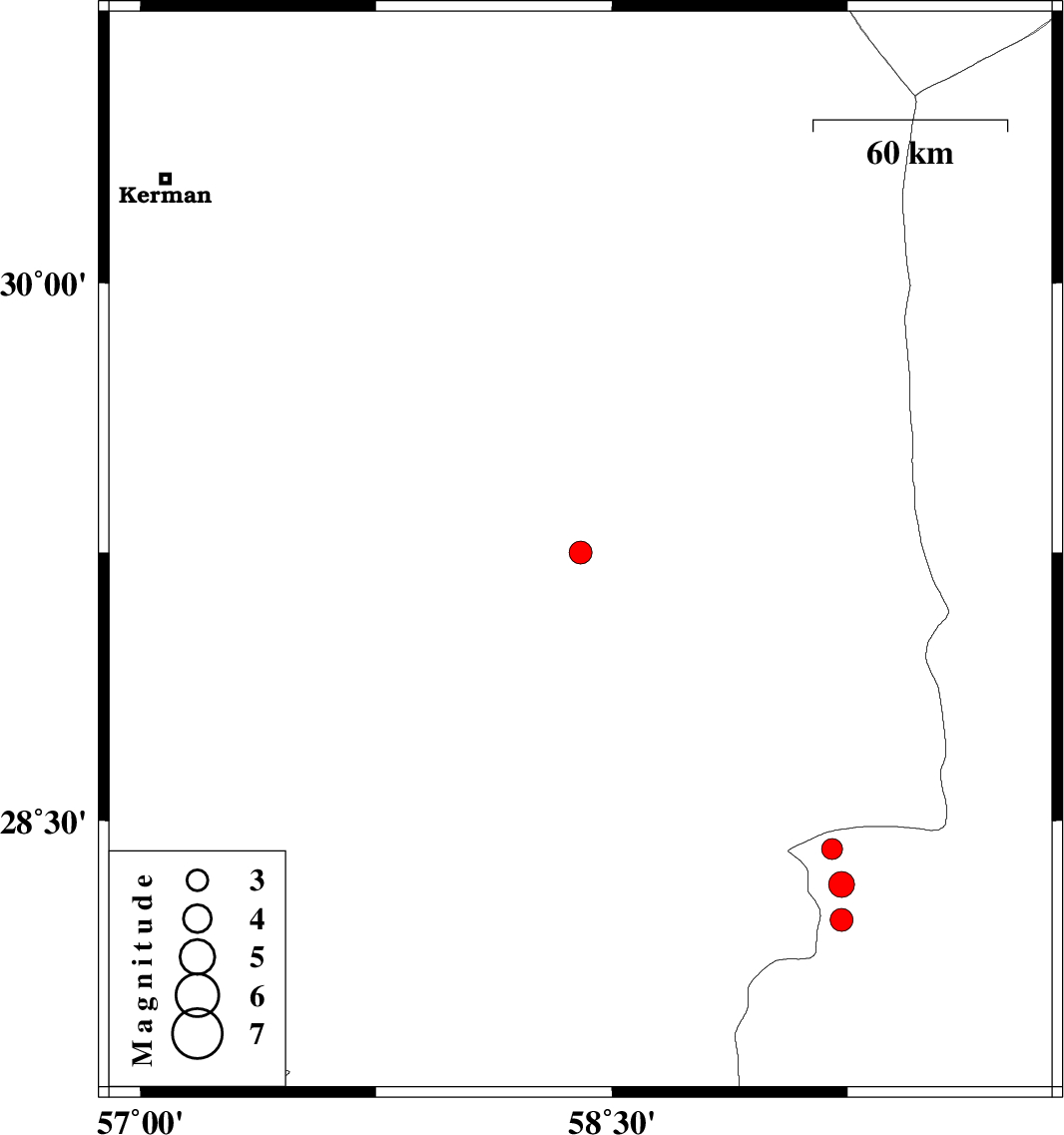 | 2011/01/23 | 07:51:59.3 | 11:21:59.3 | 28.42 | 59.2 | 17 | ML2.9 | Sistan va Baloochestan Province, 112 km South-East of Bam | ||