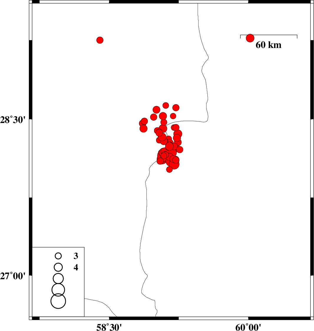 2011/01/27 16:58:55.7 20:28:55.7 28.359.0814 ML3 Kerman Province, 114 km South-East of Bam