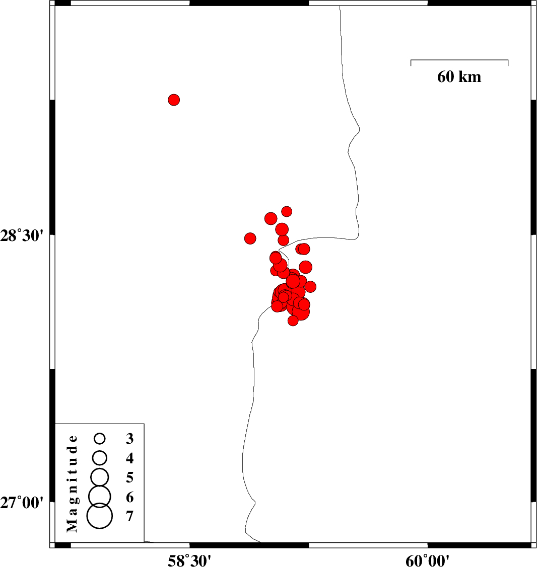 2011/01/27 08:38:28.5 12:08:28.5 28.1559.0915 Mb6.2 Kerman Province, 139 km North-East of Kahnuj