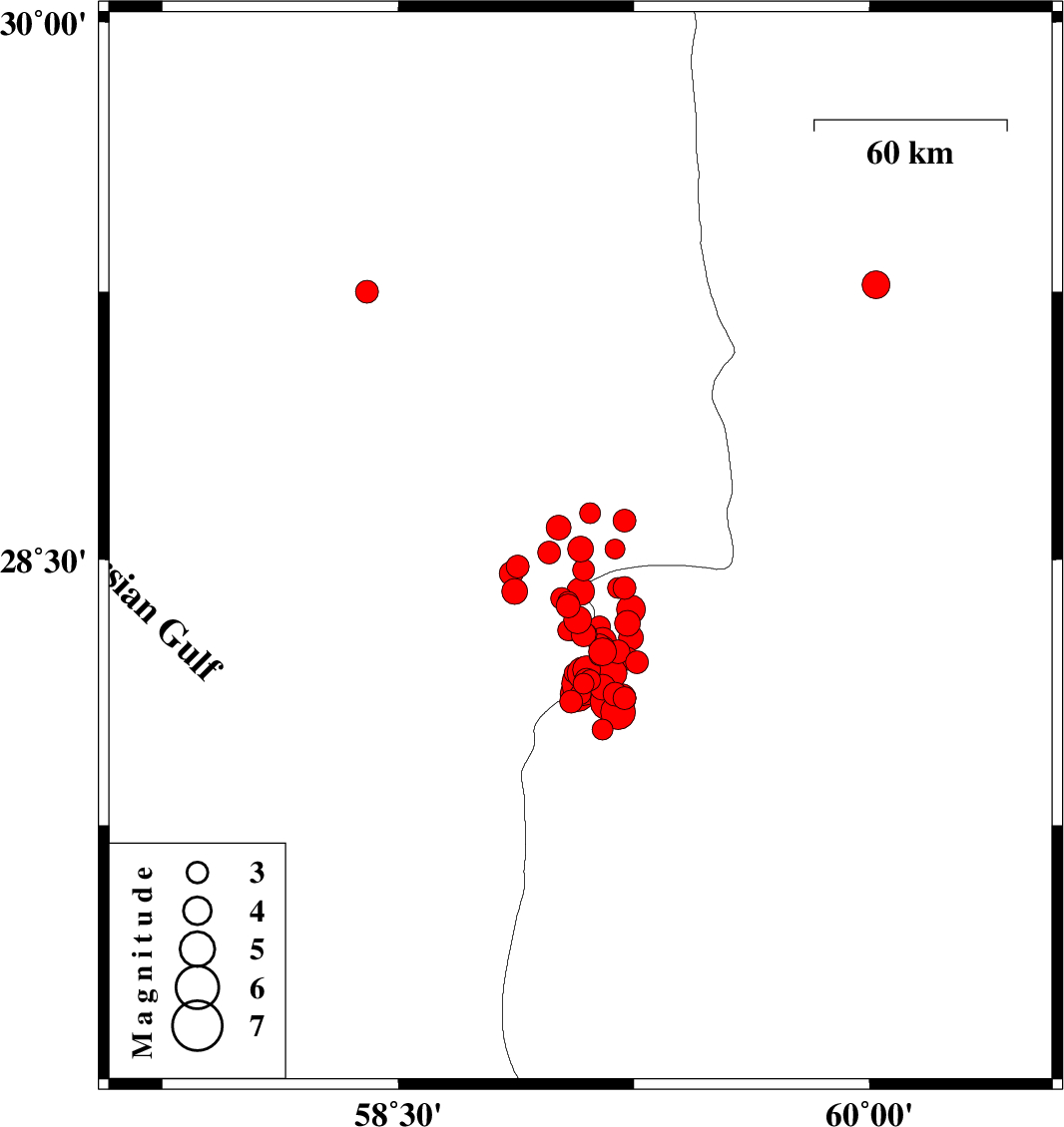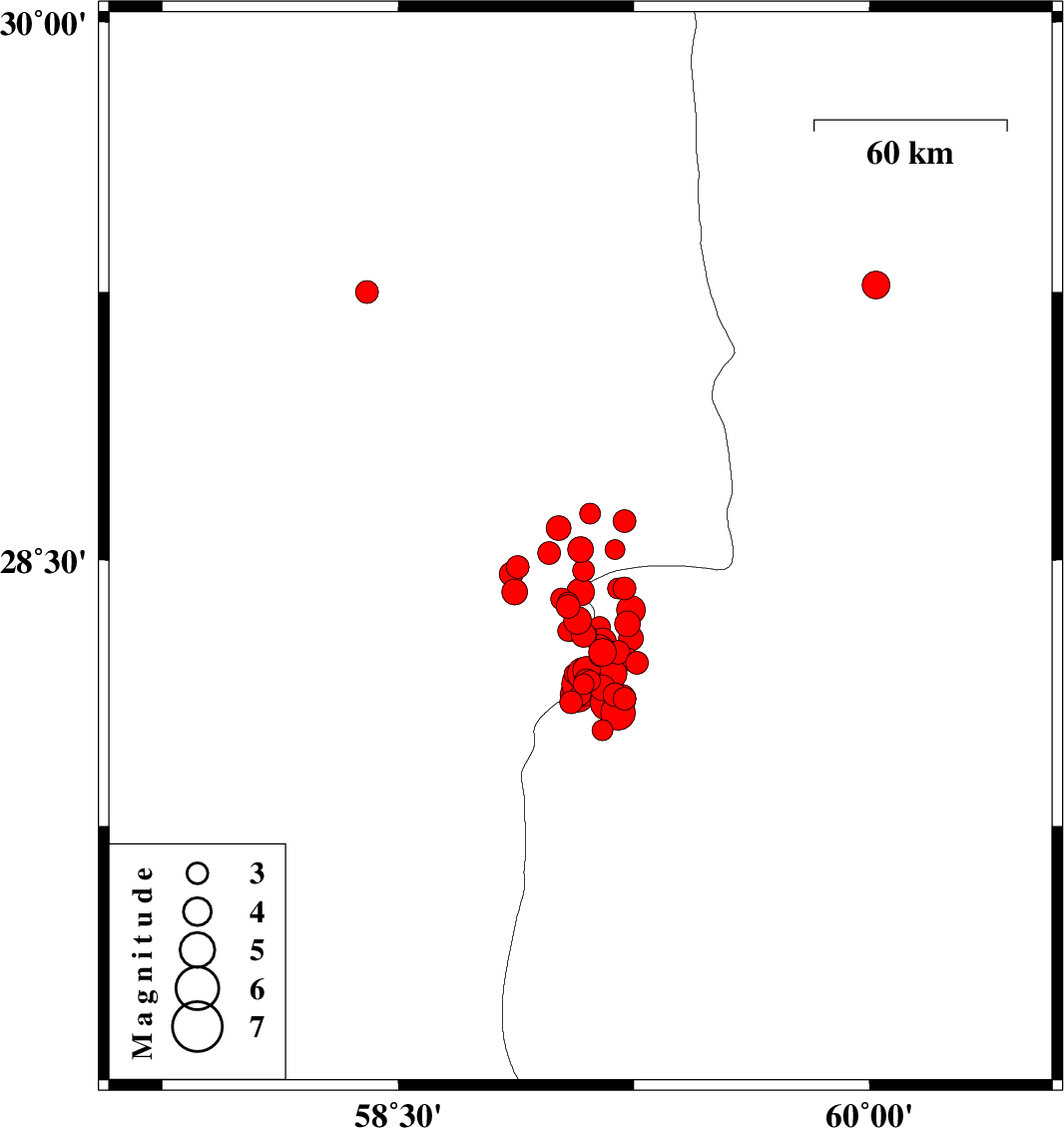 | 2011/01/27 | 09:15:29.9 | 12:45:29.9 | 28.59 | 59.01 | 15 | ML3.5 | Kerman Province, 86 km South-East of Bam | ||