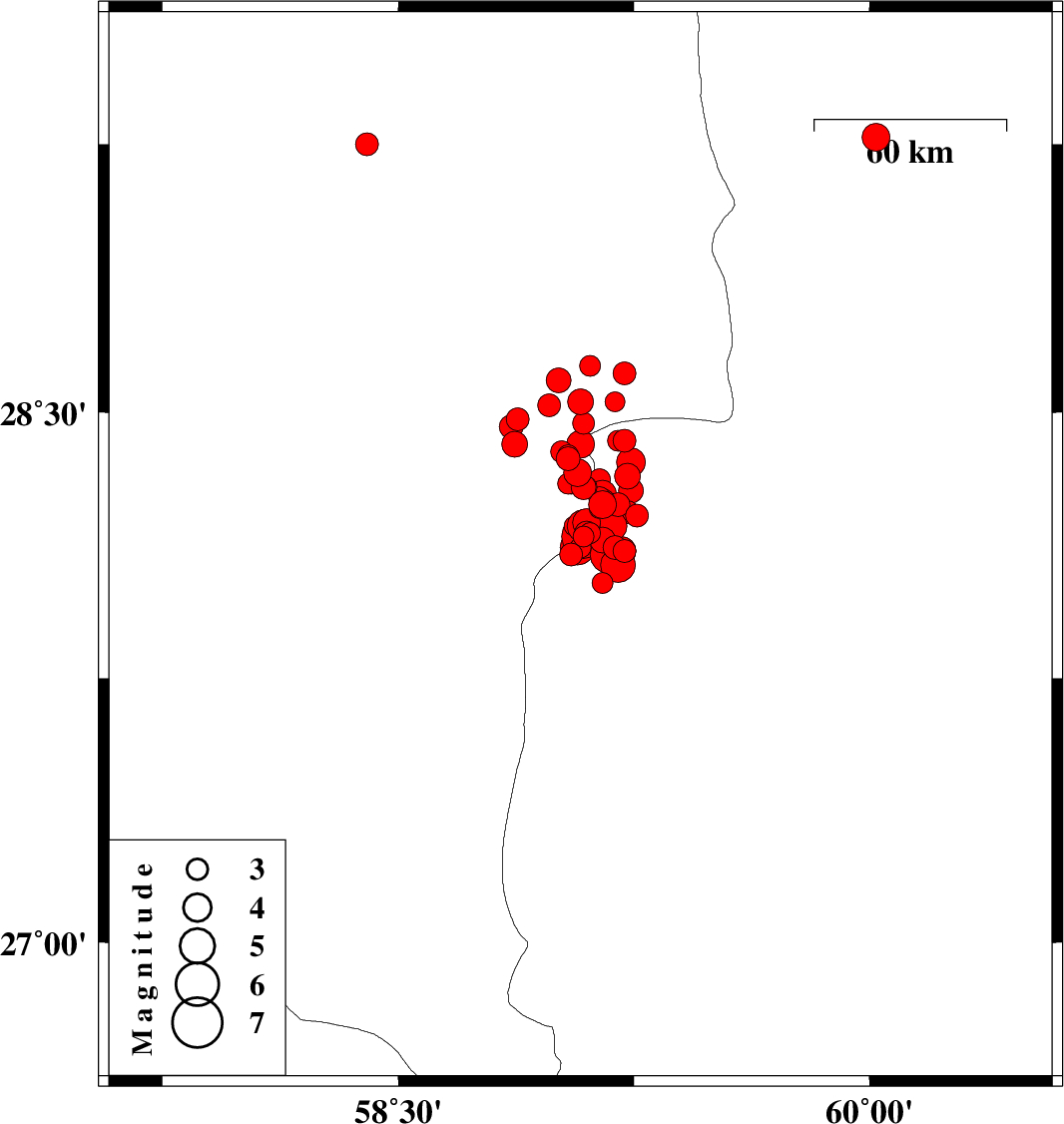 2011/01/27 08:38:28.5 12:08:28.5 28.1559.0915 Mb6.2 Kerman Province, 139 km North-East of Kahnuj