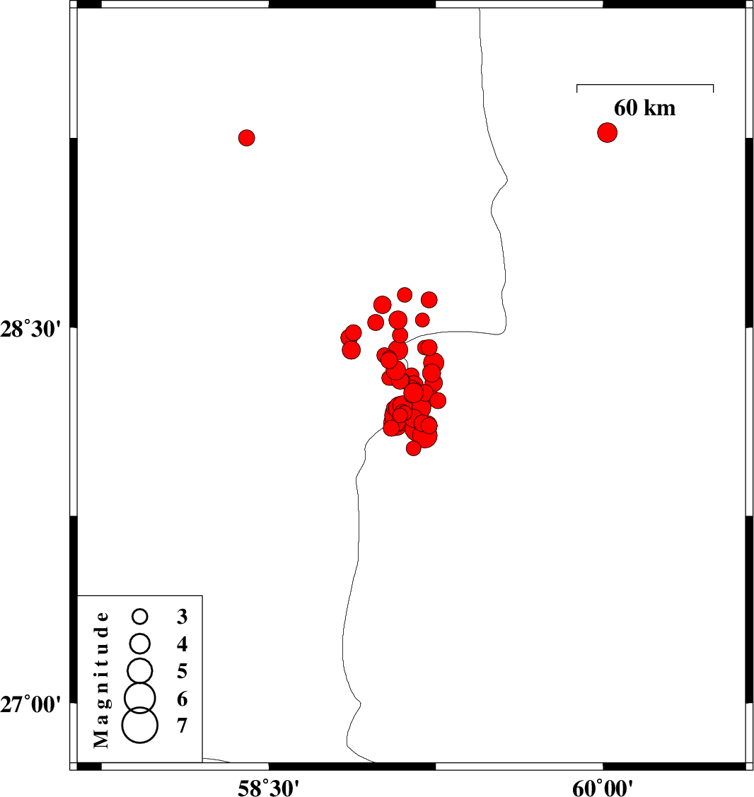 | 2011/01/27 | 08:38:28.5 | 12:08:28.5 | 28.15 | 59.09 | 15 | Mb6.2 | Kerman Province, 139 km North-East of Kahnuj | ||