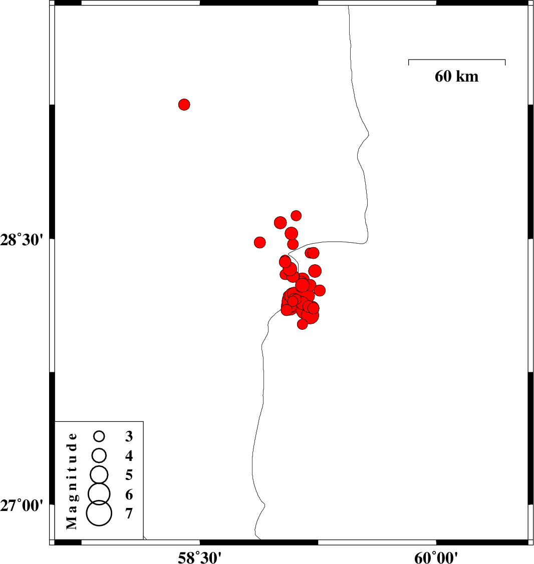 | 2011/01/27 | 08:38:28.5 | 12:08:28.5 | 28.15 | 59.09 | 15 | Mb6.2 | Kerman Province, 139 km North-East of Kahnuj | ||