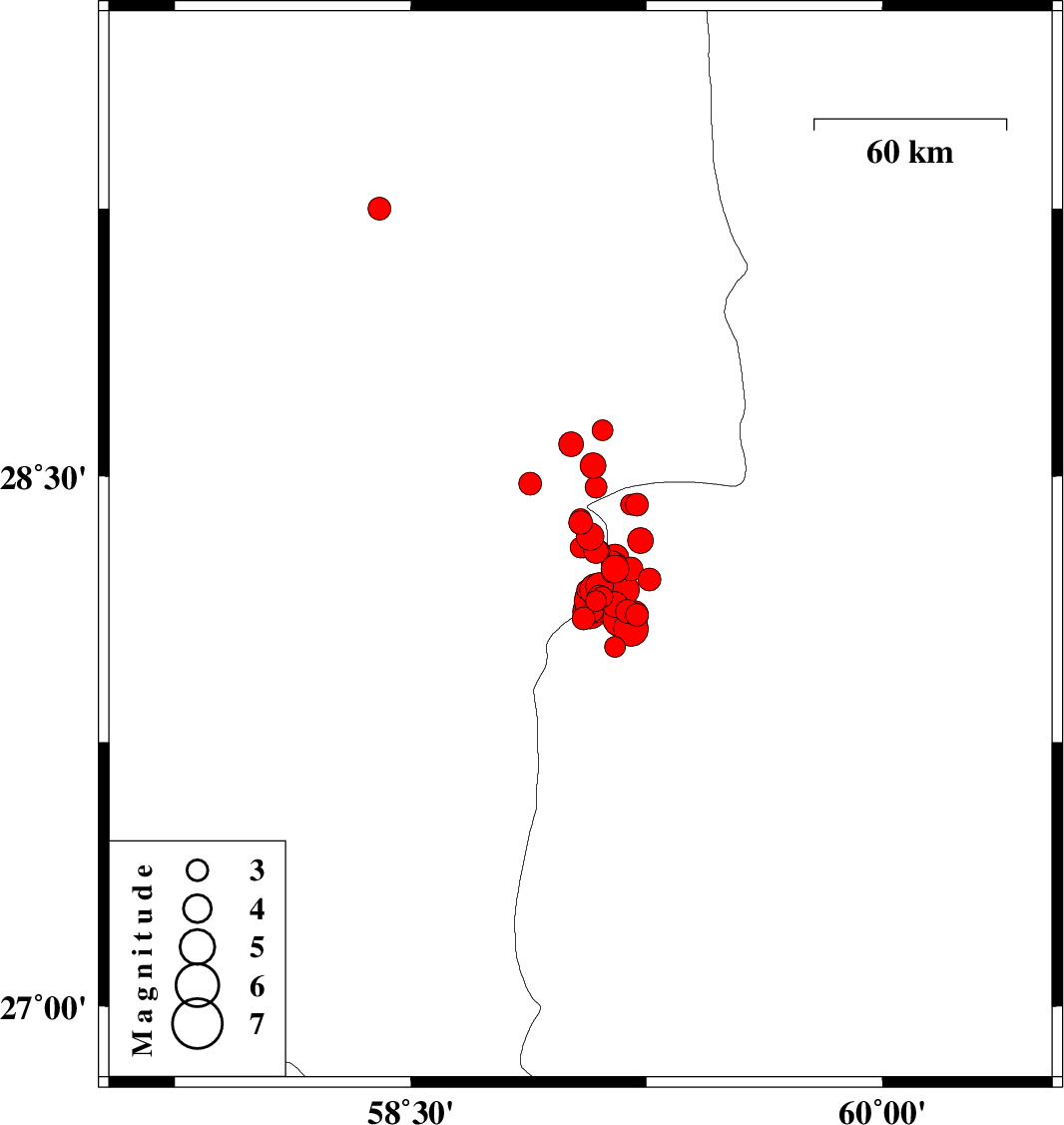 | 2011/01/27 | 09:07:53.3 | 12:37:53.3 | 28.07 | 59.2 | 15 | ML5 | Sistan va Baloochestan Province, 148 km North-East of Kahnuj | ||