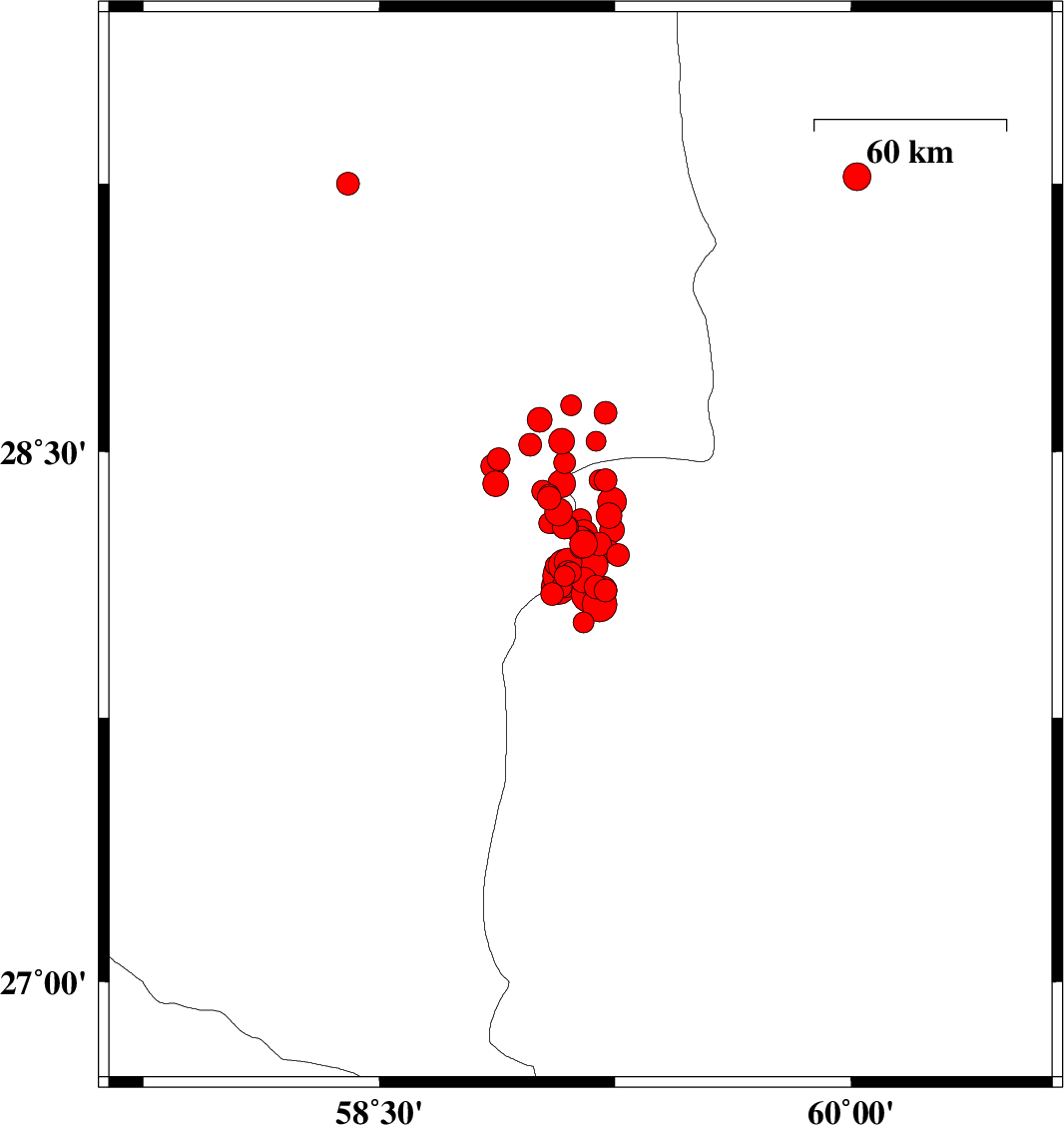 | 2011/01/02 | 15:23:46.1 | 18:53:46.1 | 28.36 | 59.24 | 16 | ML4.1 | Sistan va Baloochestan Province, 120 km South-East of Bam | ||