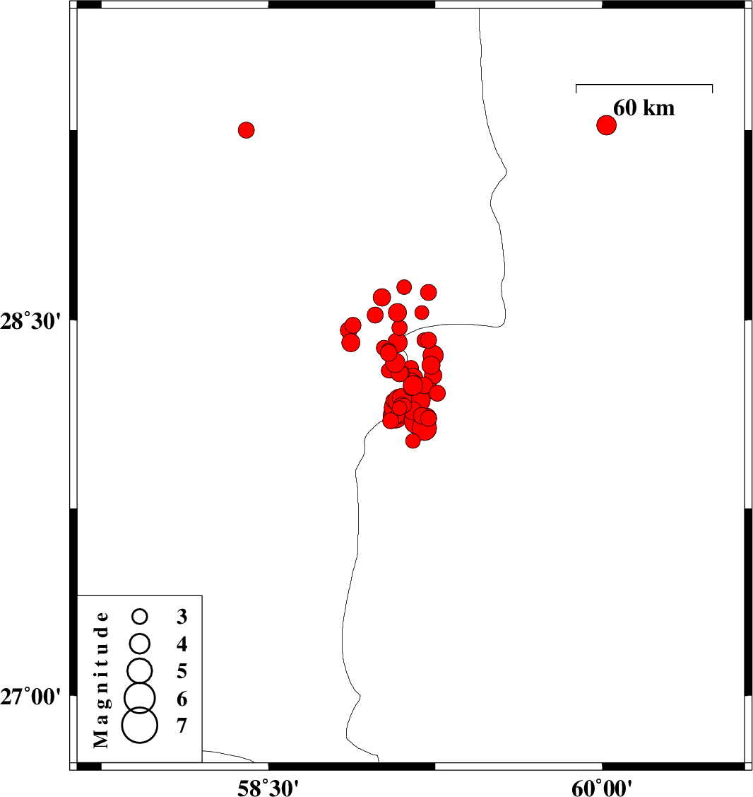 | 2011/01/27 | 08:38:28.5 | 12:08:28.5 | 28.15 | 59.09 | 15 | Mb6.2 | Kerman Province, 139 km North-East of Kahnuj | ||