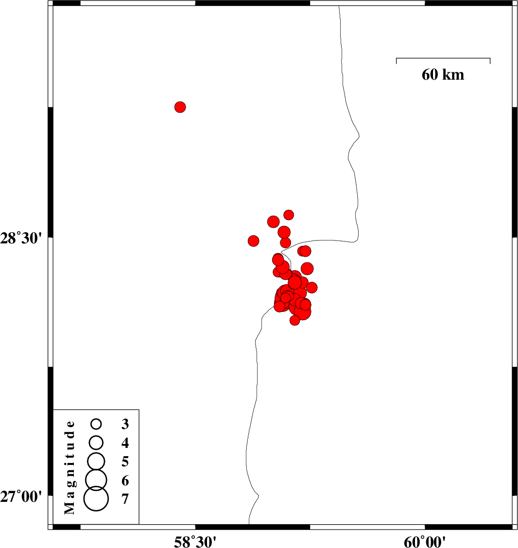 2011/01/27 08:38:28.5 12:08:28.5 28.1559.0915 Mb6.2 Kerman Province, 139 km North-East of Kahnuj