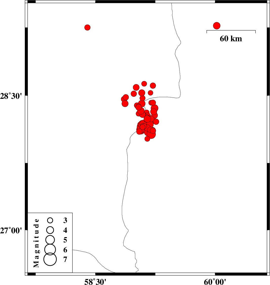 2011/01/27 08:38:28.5 12:08:28.5 28.1559.0915 Mb6.2 Kerman Province, 139 km North-East of Kahnuj